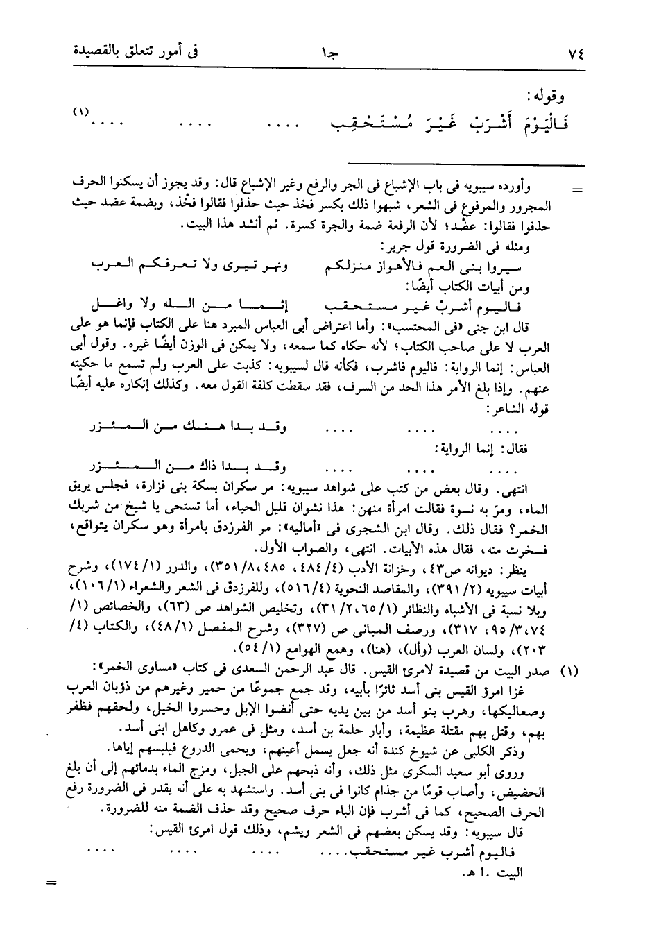 قال ابن جنى «فى المحتسب»: وأما اعتراض أبى العباس المبرد هنا على الكتاب فإنما هو على العرب لا على صاحب الكتاب؛ لأنه حكاه كما سمعه، ولا يمكن فى الوزن أيضا غيره. وقول أبى العباس: إنما الرواية: فاليوم فاشرب، فكأنه قال لسيبويه: كذبت على العرب ولم تسمع ما حكيته عنهم. وإذا بلغ الأمر هذا الحد من السرف، فقد سقطت كلفة القول معه. وكذلك إنكاره عليه أيضا قوله الشاعر: