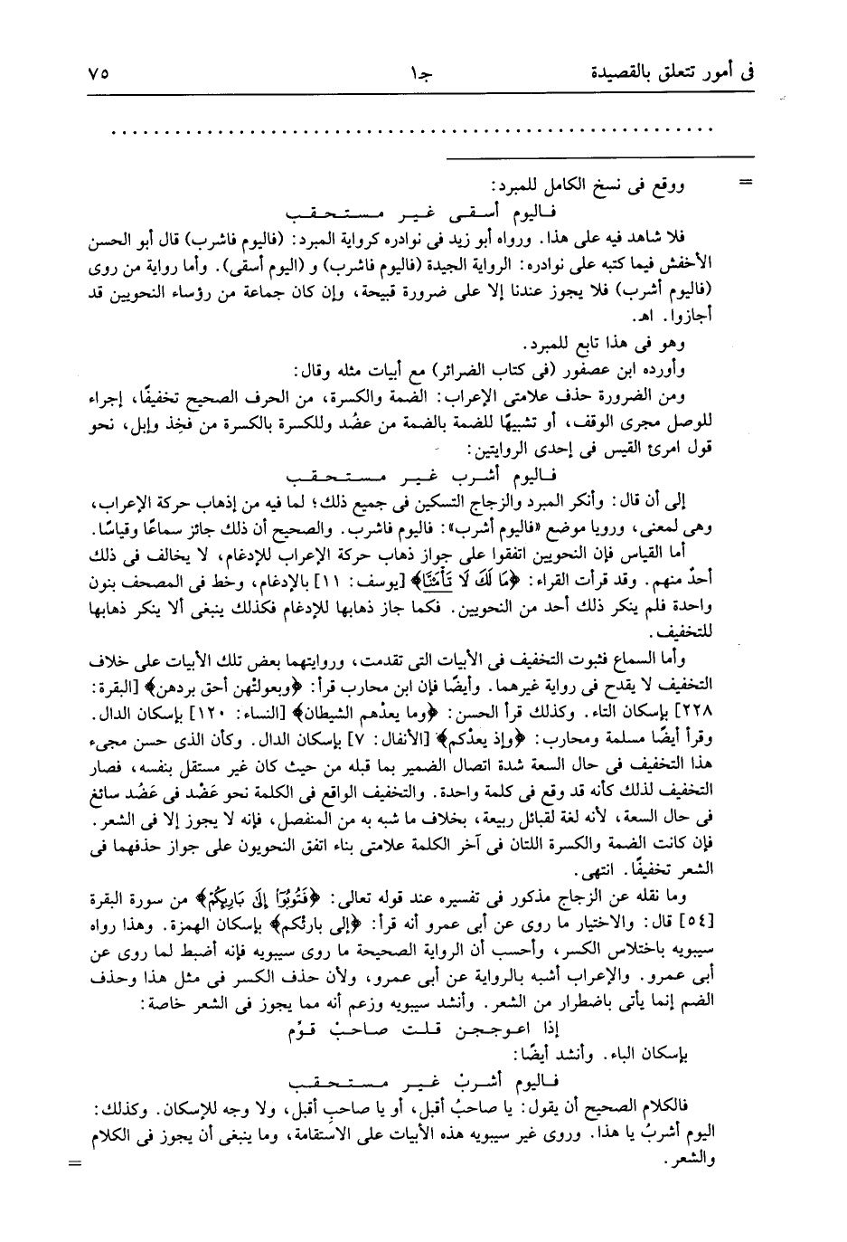 فاليوم أشرب غير مستحقب إلى أن قال: وأنكر المبرد والزجاج التسكين فى جميع ذلك؛ لما فيه من إذهاب حركة الإعراب، وهى لمعنى، ورويا موضع «فاليوم أشرب»: فاليوم فاشرب. والصحيح أن ذلك جائز سماعا وقياسا.