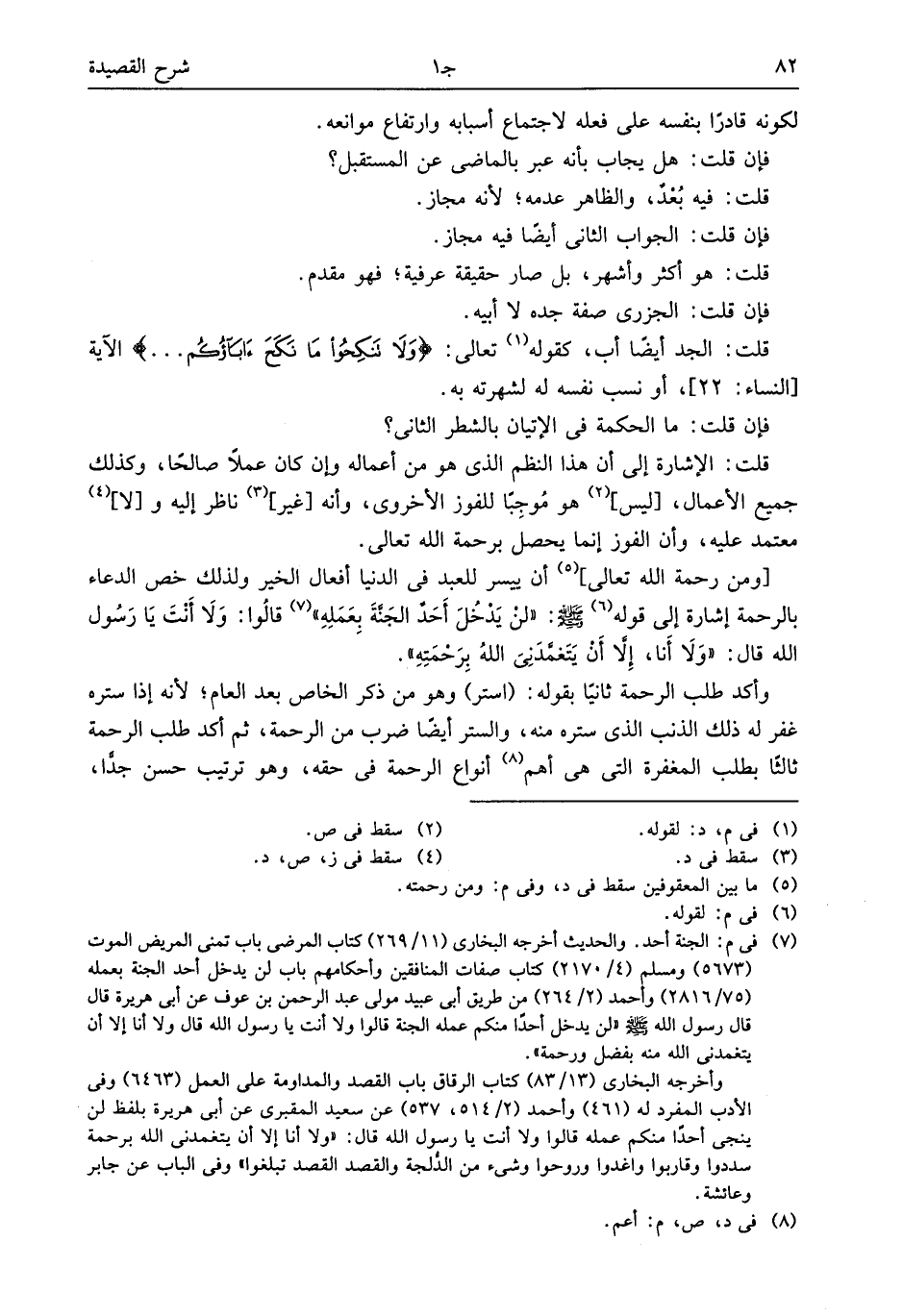 قلت: الإشارة إلى أن هذا النظم الذى هو من أعماله وإن كان عملا صالحا، وكذلك جميع الأعمال، [ليس] (¬2) هو موجبا للفوز الأخروى، وأنه [غير] (¬3) ناظر إليه و [لا] (¬4) معتمد عليه، وأن الفوز إنما يحصل برحمة الله تعالى.