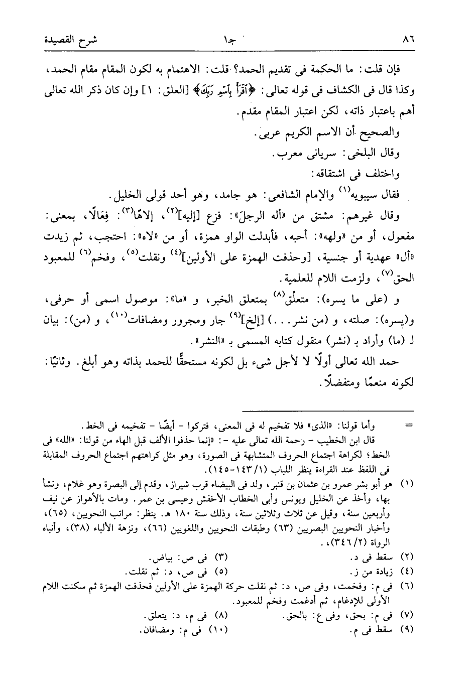 (¬6) فى م: وفخمت، وفى ص، د: ثم نقلت حركة الهمزة على الأولين فحذفت الهمزة ثم سكنت اللام الأولى للإدغام، ثم أدغمت وفخم للمعبود.