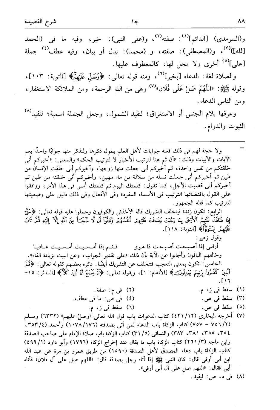 و (السرمدى) [الدائم] (¬1): صفته (¬2)، و (على النبى): خبر، وفيه ما فى (الحمد [لله]) (¬3)، و (المصطفى): صفته، و (محمد): بدل أو بيان، وفيه عطف (¬4) جملة [على] (¬5) أخرى ولا محل لها، كالمعطوف عليها.