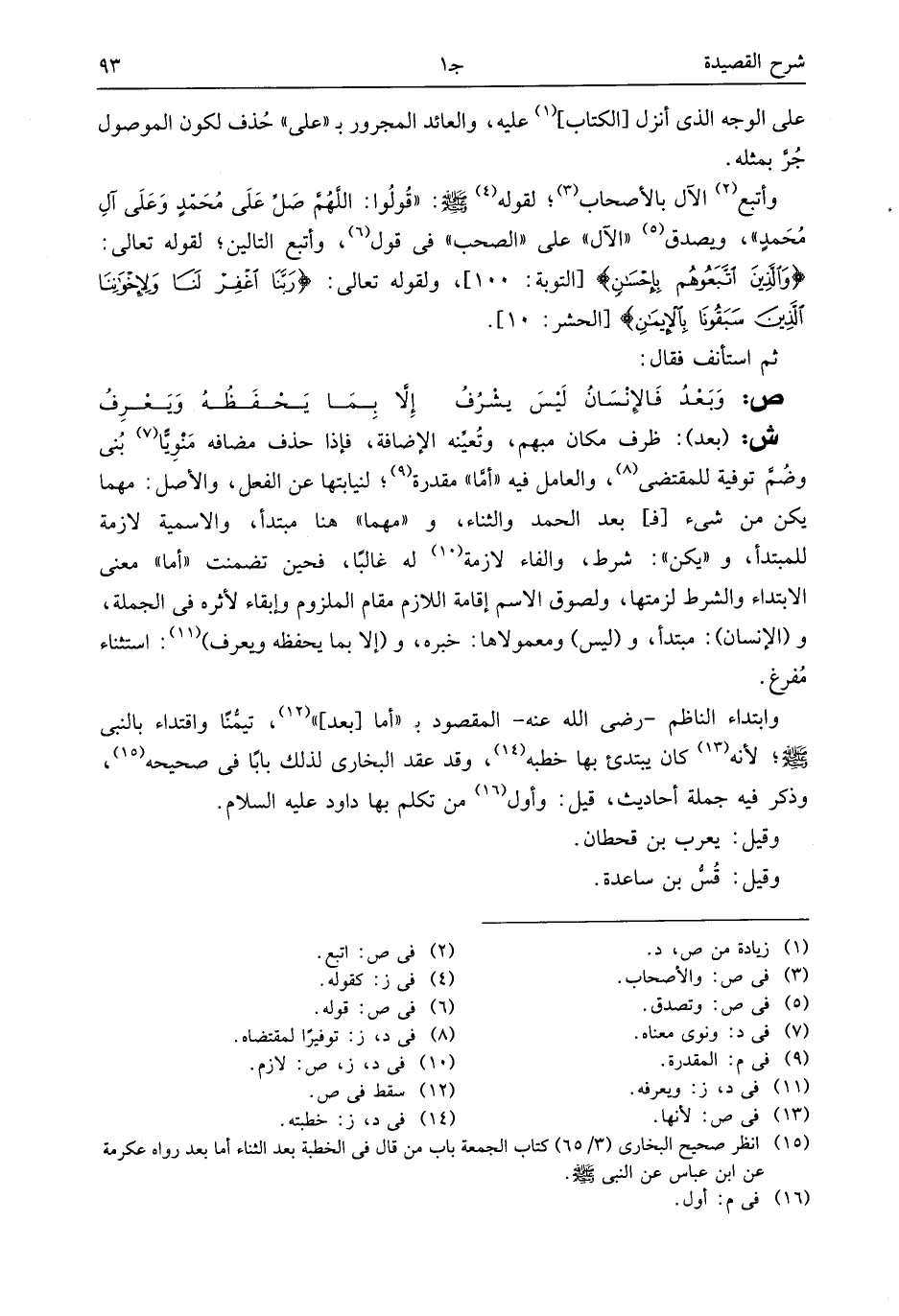 ش: (بعد): ظرف مكان مبهم، وتعيّنه الإضافة، فإذا حذف مضافه منويّا (¬7) بنى وضمّ توفية للمقتضى (¬8)، والعامل فيه «أمّا» مقدرة (¬9)؛ لنيابتها عن الفعل، والأصل: مهما يكن من شىء [ف] بعد الحمد والثناء، و «مهما» هنا مبتدأ، والاسمية لازمة للمبتدإ، و «يكن»: شرط، والفاء لازمة (¬10) له غالبا، فحين تضمنت «أما» معنى الابتداء والشرط لزمتها، ولصوق الاسم إقامة اللازم مقام الملزوم وإبقاء لأثره فى الجملة، و (الإنسان): مبتدأ، و (ليس) ومعمولاها: خبره، و (إلا بما يحفظه ويعرف) (¬11): استثناء مفرغ.