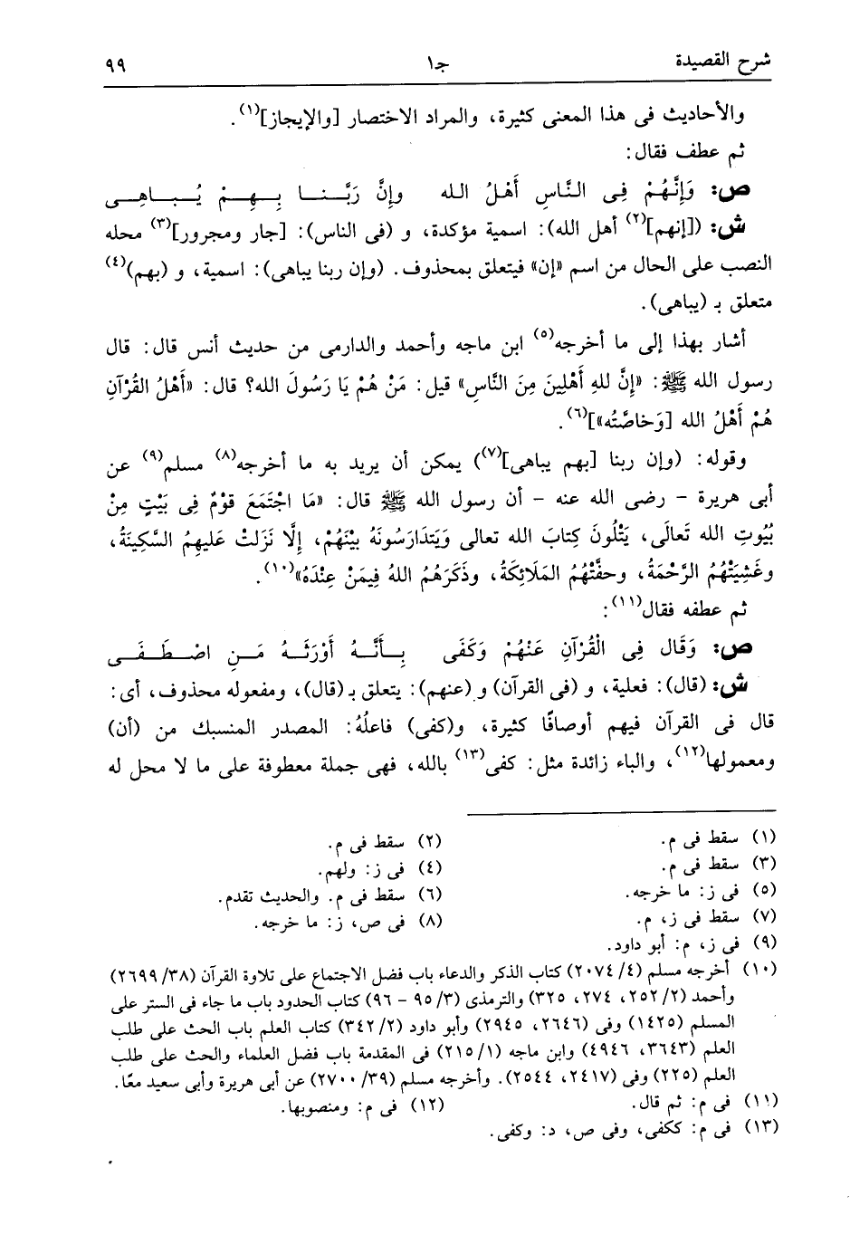 ش: ([إنهم] (¬2) أهل الله): اسمية مؤكدة، و (فى الناس): [جار ومجرور] (¬3) محله النصب على الحال من اسم «إن» فيتعلق بمحذوف. (وإن ربنا يباهى): اسمية، و (بهم) (¬4) متعلق ب (يباهى).