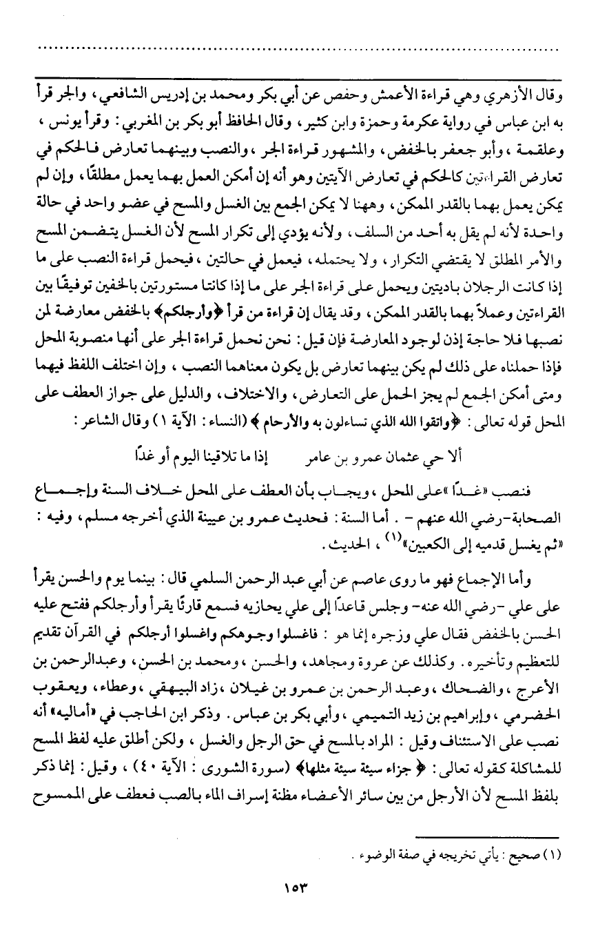 ـــــــــــــــــــــــــــــQوقال الأزهري وهي قراءة الأعمش وحفص عن أبي بكر ومحمد بن إدريس الشافعي، والجر قرأ به ابن عباس في رواية عكرمة وحمزة وابن كثير، وقال الحافظ أبو بكر بن المغربي: وقرأ يونس، وعلقمة، وأبو جعفر بالخفض، والمشهور قراءة الجر، والنصب وبينهما تعارض فالحكم في تعارض القراءتين كالحكم في تعارض الآيتين، وهو أنه إن أمكن العمل بهما يعمل مطلقا، وإن لم يمكن.. يعمل بهما بالقدر الممكن، وهاهنا لا يمكن الجمع بين الغسل والمسح في عضو واحد في حالة واحدة؛ لأنه لم يقل به أحد من السلف، ولأنه يؤدي إلى تكرار المسح؛ لأن الغسل يتضمن المسح، والأمر المطلق لا يقتضي التكرار، ولا يحتمله، فيعمل في حالتين، فيحمل قراءة النصب على ما إذا كانت الرجلان باديتين ويحمل على قراءة الجر على ما إذا كانتا مستورتين بالخفين توفيقا بين القراءتين وعملا بهما بالقدر الممكن، وقد يقال إن قراءة من قرأ {وَأَرْجُلَكُمْ} [المائدة: 6] بالخفض معارضة لمن نصبها فلا حاجة إذن لوجود المعارضة فإن قيل: نحن نحمل قراءة الجر على أنها منصوبة المحل فإذا حملناه على ذلك لم يكن بينهما تعارض بل يكون معناهما النصب، وإن اختلف اللفظ فيهما، ومتى أمكن الجمع لم يجز الحمل على التعارض، والاختلاف، والدليل على جواز العطف على المحل قَوْله تَعَالَى: {وَاتَّقُوا اللَّهَ الَّذِي تَسَاءَلُونَ بِهِ وَالْأَرْحَامَ} [النساء: 1] (النساء: الآية 1) وقال الشاعر: