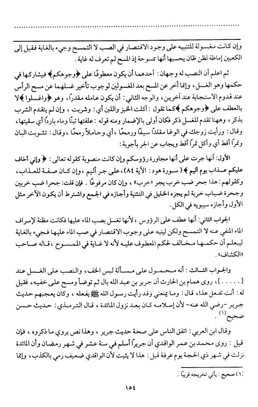 والجواب الثالث: أنه محمول على مسألة لبس الخف، والنصب على الغسل عند [......] ، روى همام بن الحارث «أن جرير بن عبد الله بال ثم توضأ ومسح على خفيه، فقيل له: أنت تفعل هذا، قال: وما يمنعني وقد رأيت رسول الله - صَلَّى اللَّهُ عَلَيْهِ وَسَلَّمَ - يفعله» وكان يعجبهم حديث جرير - رَضِيَ اللَّهُ عَنْهُ - لأن إسلامه كان بعد نزول المائدة، قال الترمذي: حديث حسن صحيح.