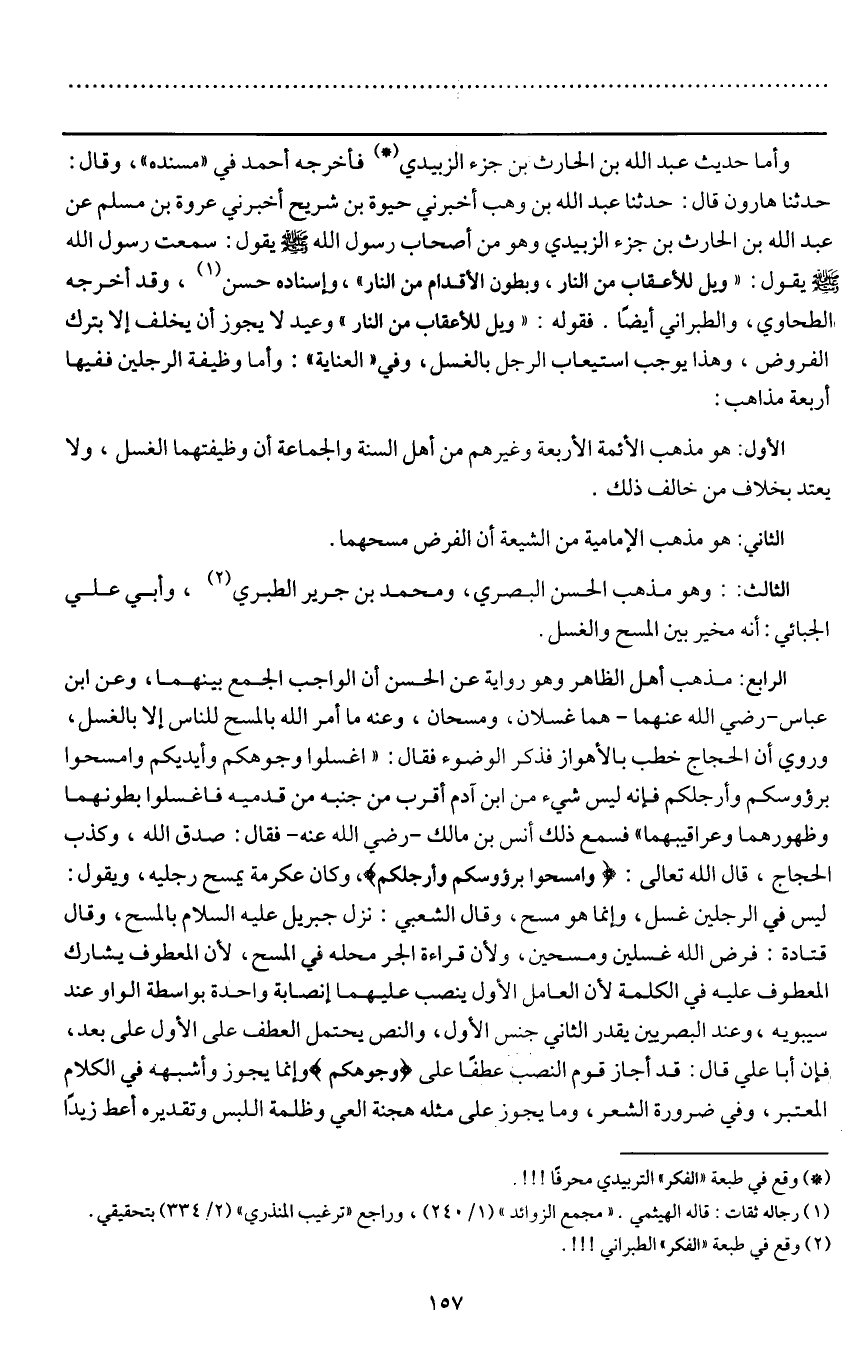 ـــــــــــــــــــــــــــــQوأما حديث عبد الله بن الحارث بن جزء الزبيدي فأخرجه أحمد في " مسنده "، وقال: حدثنا هارون قال: حدثنا عبد الله بن وهب أخبرني حيوة بن شريح أخبرني عروة بن مسلم عن عبد الله بن الحارث بن جزء الزبيدي وهو من أصحاب رسول الله - صَلَّى اللَّهُ عَلَيْهِ وَسَلَّمَ - يقول: سمعت رسول الله - صَلَّى اللَّهُ عَلَيْهِ وَسَلَّمَ - يقول: «ويل للأعقاب من النار، وبطون الأقدام من النار» وإسناده حسن، وقد أخرجه الطحاوي، والطبراني أيضا. فقوله: " ويل للأعقاب من النار " وعيد لا يجوز أن يخلف إلا بترك الفروض، وهذا يوجب استيعاب الرجل بالغسل،