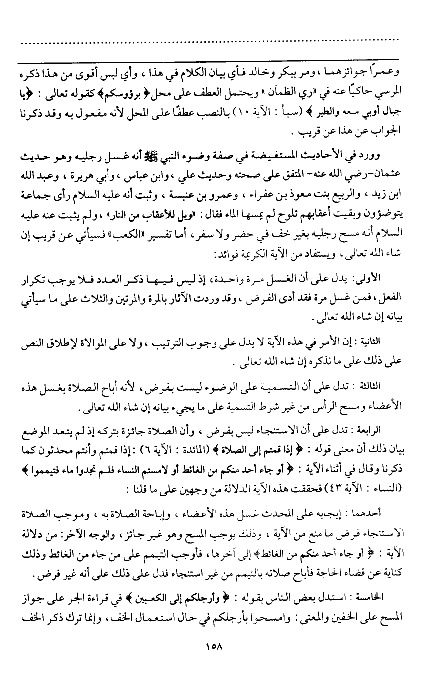 وورد في الأحاديث المستفيضة في صفة وضوء النبي - صَلَّى اللَّهُ عَلَيْهِ وَسَلَّمَ - أنه غسل رجليه، وهو حديث عثمان - رَضِيَ اللَّهُ عَنْهُ - المتفق على صحته وحديث علي، وابن عباس، وأبي هريرة، وعبد الله ابن زيد، والربيع بنت معوذ بن عفراء، وعمرو بن عنبسة، وثبت أنه - عَلَيْهِ السَّلَامُ - رأى جماعة يتوضؤون وبقيت أعقابهم تلوح لم يمسها الماء فقال، «ويل للأعقاب من النار» ، ولم يثبت عنه - عَلَيْهِ السَّلَامُ - أنه مسح رجليه بغير خف في حضر ولا سفر، أما تفسير " الكعب " فسيأتي عن قريب إن شاء الله تعالى، ويستفاد من الآية الكريمة فوائد: