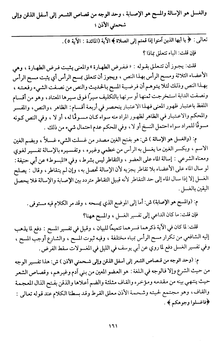 والغسل هو الإسالة والمسح هو الإصابة، وحد الوجه من قصاص الشعر إلى أسفل الذقن وإلى شحمتي الأذن؛