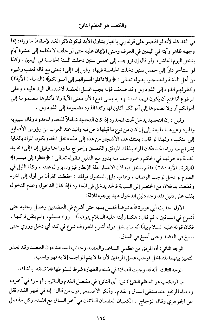 وقيل: إن التحديد يدخل تحت المحدود إذا كان التحديد شاملا للحد والمحدود، وقال سيبويه والمبرد وغيرهما: ما بعد إلى إن كان من نوع ما قبلها دخل فيه، واليد عند العرب من رؤوس الأصابع إلى المنكب، ولهذا لو قال: بعتك هذه الأشجار من هذه إلى هذه دخل الحد ويكون المراد بالغاية إخراج ما وراء الحد فكان المراد بذلك المرافق والكعبين وإخراج ما وراءها وقيل إن " إلى " تفيد الغاية ودخولها في الحكم وخروجها منه يدور مع الدليل فقوله تعالى: {فَنَظِرَةٌ إِلَى مَيْسَرَةٍ} [البقرة: 280] (البقرة: الآية 280) مما لم يدخل فيه لأن الاعتبار علة الإنظار فيزول بزوال علته، وكذلك الليل في الصوم لو دخل لوجب الوصال، ومما فيه دليل الدخول قولك: حفظت القرآن من أوله إلى آخره وقطعت يد فلان من الخنصر إلى السبابة فالحد يدخل في المحدود فإذا كان الدخول وعدم الدخول يقف على دليل فقد وجد دليل الدخول هاهنا بوجوه ثلاثة: