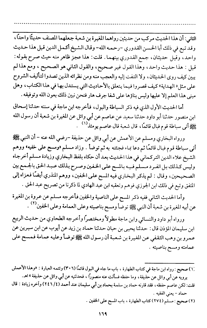ـــــــــــــــــــــــــــــQالثاني: أن هذا الحديث مركب من حديثين رواهما المغيرة بن شعبة، جعلهما المصنف حديثا واحدا، وقد تبع في ذلك أبا الحسن القدوري - رَحِمَهُ اللَّهُ - وقال الشيخ أكمل الدين قيل هذا حديث واحد، وقيل حديثان، جمع القدوري بينهما. قلت: هذا عجز ظاهر منه حيث صرح بقوله: قيل: هذا حديث واحد، وهذا القول غير صحيح، والقول الثاني هو الصحيح، ومع هذا لم يبين كيف روى الحديثان، ولا التفت إليه والعجب منه ومن نظرائه الذين تصدوا لتأليف الشروح على مثل " الهداية " كيف قصروا فيما يتعلق بالأحاديث التي يستدل بها في هذا الكتاب، وهل مبنى هذا العلم إلا عليها وليس بناؤها على شفا جرف هار، فنحن بين ذلك بعون الله وتوفيقه.