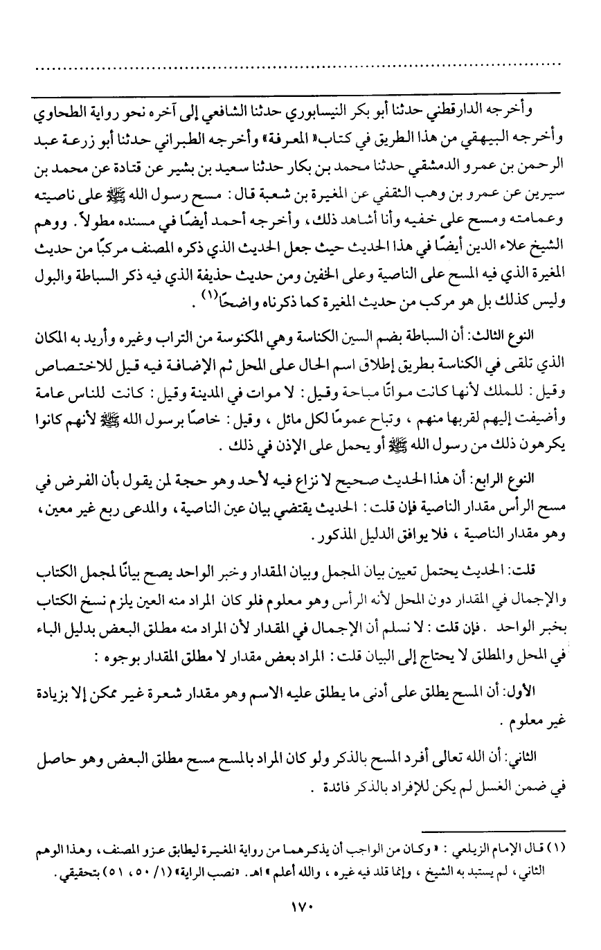 النوع الرابع: أن هذا الحديث صحيح لا نزاع فيه لأحد وهو حجة لمن يقول بأن الفرض في مسح الرأس مقدار الناصية فإن قلت: الحديث يقتضي بيان عين الناصية، والمدعى ربع غير معين، وهو مقدار الناصية، فلا يوافق الدليل المذكور.
