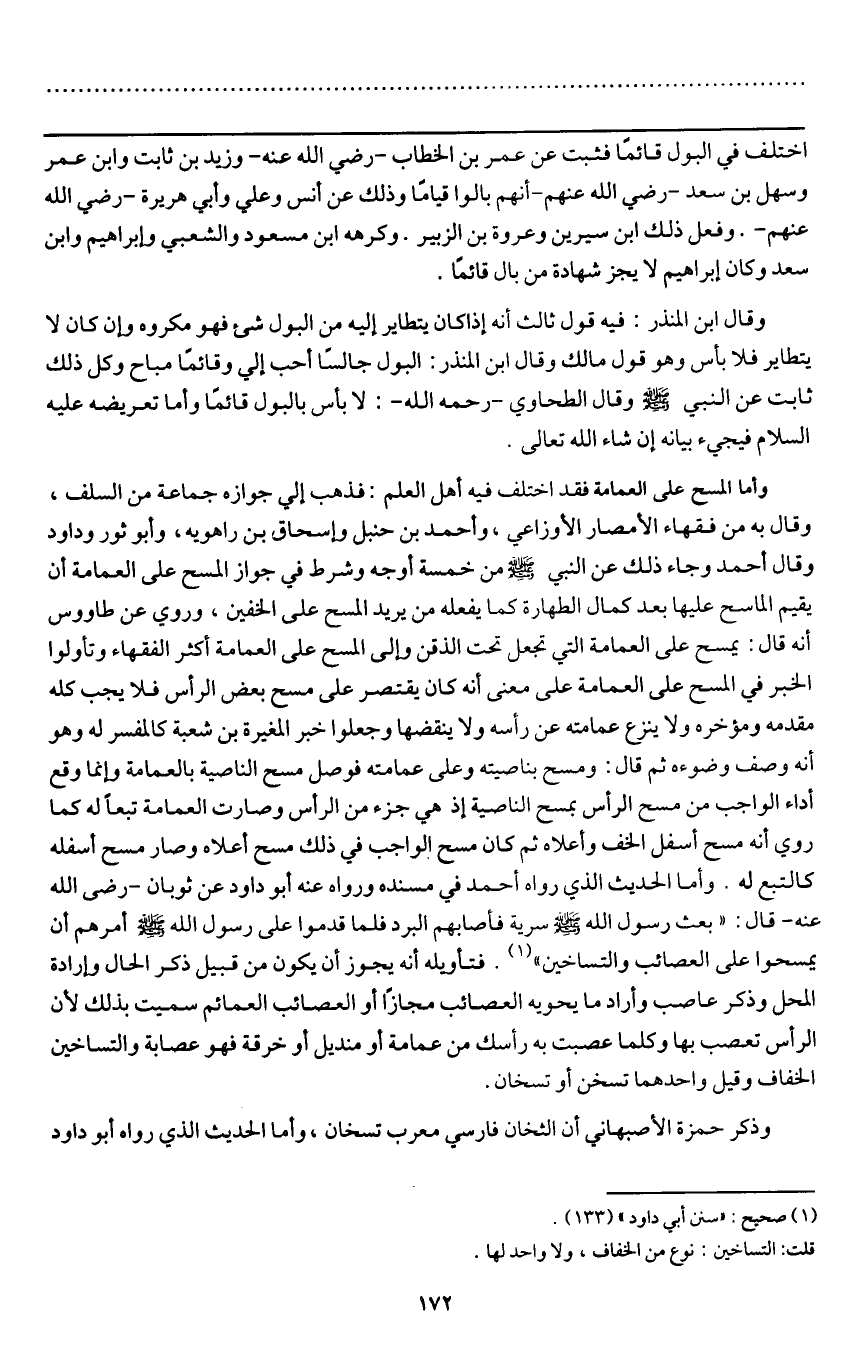 وأما المسح على العمامة فقد اختلف فيه أهل العلم: فذهب إلى جوازه جماعة من السلف، وقال به من فقهاء الأمصار الأوزاعي، وأحمد بن حنبل وإسحاق بن راهويه، وأبو ثور وداود وقال أحمد وجاء ذلك عن النبي - صَلَّى اللَّهُ عَلَيْهِ وَسَلَّمَ - من خمسة أوجه، وشرط في جواز المسح على العمامة أن يقيم الماسح عليه بعد كمال الطهارة كما يفعله من يريد المسح على الخفين، وروي عن طاووس أنه قال: يمسح على العمامة التي تجعل تحت الذقن وإلى المسح على العمامة أكثر الفقهاء، وتأولوا الخبر في المسح على العمامة على معنى أنه كان يقتصر على مسح بعض الرأس فلا يجب كله مقدمه ومؤخره ولا ينزع عمامته عن رأسه ولا ينقضها، وجعلوا خبر المغيرة بن شعبة كالمفسر له وهو أنه وصف وضوءه ثم قال: ومسح بناصيته وعلى عمامته فوصل مسح الناصية بالعمامة وإنما وقع أداء الواجب من مسح الرأس بمسح الناصية إذ هي جزء من الرأس وصارت العمامة تبعا له كما وري أنه مسح أسفل الخف وأعلاه ثم كان مسح الواجب في ذلك مسح أعلاه وصار مسح أسفله كالتبع له. وأما الحديث الذي رواه أحمد في مسنده ورواه عنه أبو داود عن ثوبان - رَضِيَ اللَّهُ عَنْهُ - قال: «بعث رسول الله - صَلَّى اللَّهُ عَلَيْهِ وَسَلَّمَ - سرية فأصابهم البرد فلما قدموا على رسول الله - صَلَّى اللَّهُ عَلَيْهِ وَسَلَّمَ - أمرهم أن يمسحوا على العصائب والتساخين.» فتأويله أنه يجوز أن يكون من قبيل ذكر الحال وإرادة المحل وذكر عاصب وأراد ما يحويه العصائب مجازا أو العصائب العمائم، سميت بذلك؛ لأن الرأس تعصب بها وكلما عصبت به رأسك من عمامة أو منديل أو خرقة فهو عصابة والتساخين الخفاف وقيل واحدهما تسخن أو تسخان.