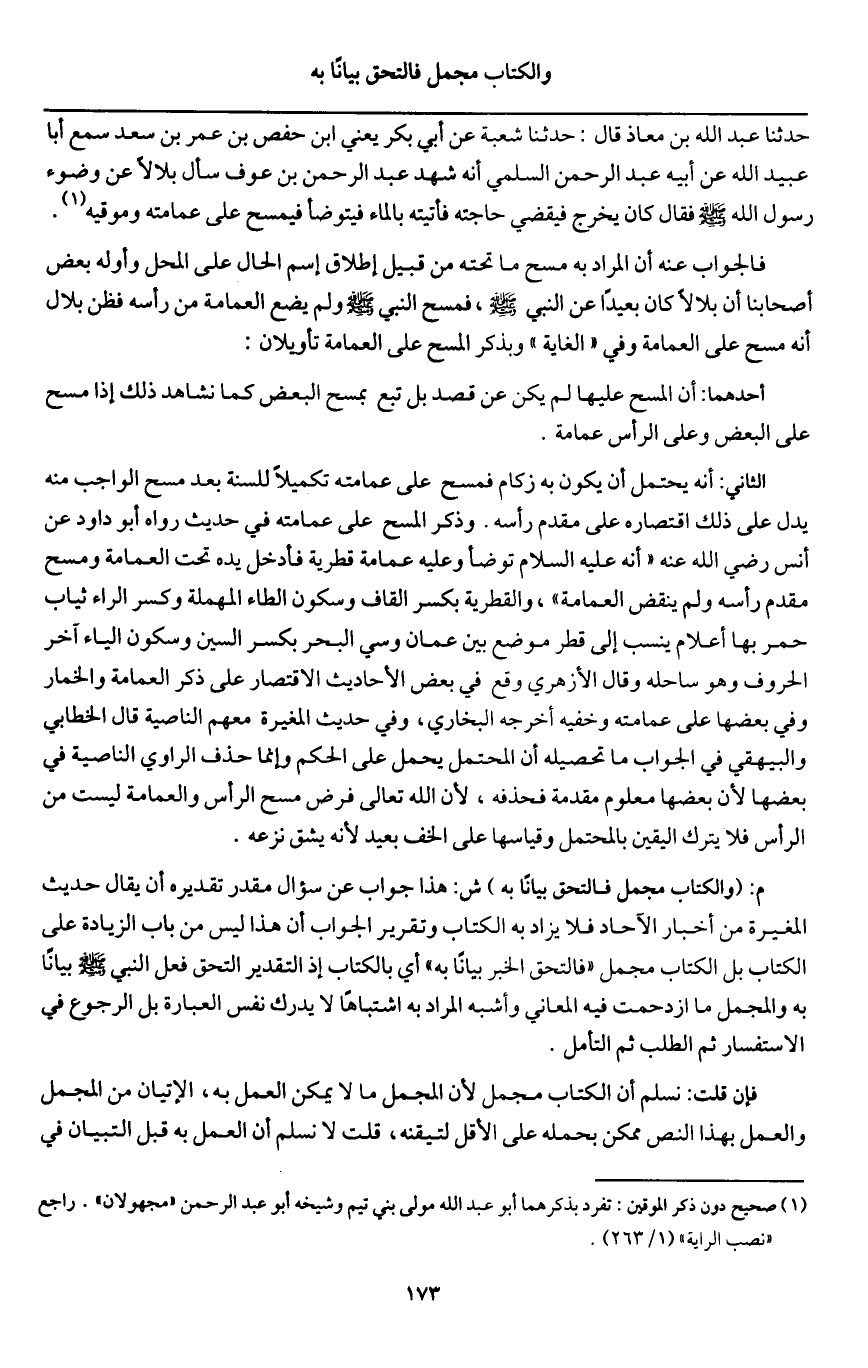 فالجواب عنه أن المراد به مسح ما تحته من قبيل إطلاق اسم الحال على المحل، وأوله بعض أصحابنا أن بلالا كان بعيدا عن النبي - صَلَّى اللَّهُ عَلَيْهِ وَسَلَّمَ -، فمسح النبي - صَلَّى اللَّهُ عَلَيْهِ وَسَلَّمَ - ولم يضع العمامة من رأسه فظن بلال أنه مسح على العمامة، وفي " الغاية " وبذكر المسح على العمامة تأويلان: