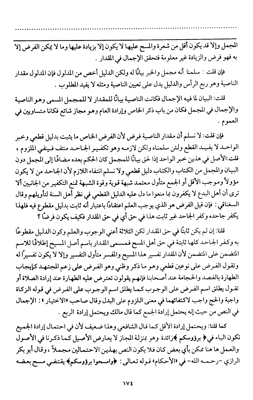 ـــــــــــــــــــــــــــــQالمجمل وإلا قد يكون أقل من شعرة والمسح عليها لا يكون إلا بزيادة عليها وما لا يمكن الفرض إلا به فهو فرض والزيادة غير معلومة فتحقق الإجمال في المقدار.