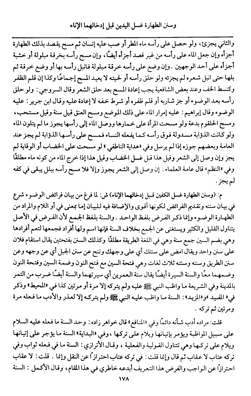 م: (وسنن الطهارة غسل الكفين قبل إدخالهما الإناء) ش: لما فرغ من بيان فرائض الوضوء شرع في بيان سننه وتقديم الفرائض لكونها أقوى، والإضافة فيه للبيان إما بمعنى في أو اللام، والمراد من الطهارة الوضوء، وإنما ذكر الفرض بلفظ الواحد. والسنة بلفظ الجمع؛ لأن الفرض في الأصل يتناول القليل والكثير ويستغني عن الجمع بخلاف السنة فإنها اسم ولها أفراد فجمعها لتعم أفرادها، وهي بضم السين جمع سنة، وهي في اللغة: الطريقة مطلقا، وكذلك السنن بفتحتين، يقال: استقام فلان على سنن واحد ويقال امض على سنتك أي على وجهك وتنح عن سنن الجبل أي عن وجهه وعن سنن الطريق وسننه وسنته ثلاث لغات وهي: فتحة السين مع فتح النون وضمة السين وفتحة النون وضمهما معا، والسنة السيرة أيضا يقال: سنة العمرين أي سيرتهما، والسنة أيضا ضرب من التمر بالمدينة، وفي الشريعة: ما واظب النبي - صَلَّى اللَّهُ عَلَيْهِ وَسَلَّمَ - عليه ولم يتركه إلا مرة أو مرتين كذا في " المحيط "، وذكر في " المفيد " و " المزيد ": السنة ما واظب عليه النبي - صَلَّى اللَّهُ عَلَيْهِ وَسَلَّمَ - ولم يتركه إلا لعذر والأدب ما فعله مرة ومرتين ثم تركه.