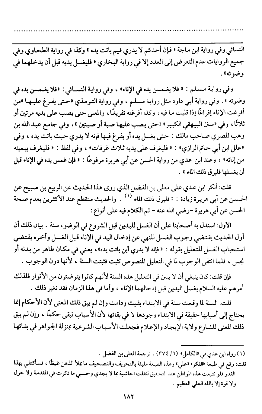 ـــــــــــــــــــــــــــــQالنسائي وفي رواية ابن ماجه «فإن أحدكم لا يدري فيم باتت يده» وكذا في رواية الطحاوي وفي جميع الروايات عدم التعرض إلى العدد إلا في رواية البخاري «فليغسل يديه قبل أن يدخلهما في وضوئه» .