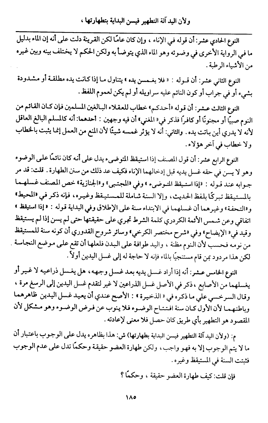 النوع الرابع عشر: أن قول المصنف إذا استيقظ المتوضئ يدل على أنه كان نائما على الوضوء وهو لا يسن في حقه غسل يديه قبل إدخالهما الإناء فكيف عد ذلك من سنن الطهارة. قلت: قد مر جوابه عند قوله: " إذا استيقظ المتوضئ " وفي " المجتبى " و " الجنازية " خص المصنف غسلهما بالمستيقظ تبركا بلفظ الحديث، وإلا السنة شاملة للمستيقظ وغيره، فإنه ذكر في " المحيط " و " التحفة " وغيرهما أن غسلهما في الابتداء سنة على الإطلاق، وفي البداية قوله: «إذا استيقظ» اتفاقي، وعن شمس الأئمة الكردري كلمة الشرط تجري على حقيقتها حتى لم يسن إذا لم يستيقظ، وقيد في " الإيضاح " وفي " شرح مختصر الكرخي " وسائر شروح القدوري أن كونه سنة للمستيقظ من نومه فحسب؛ لأن النوم مظنة، واليد طوافة على البدن فلعلها أن تقع على موضع النجاسة، لكن هذا مردود بمن قام مستنجيا بالماء فإنه لا حاجة له إلى غسل اليدين أولا.