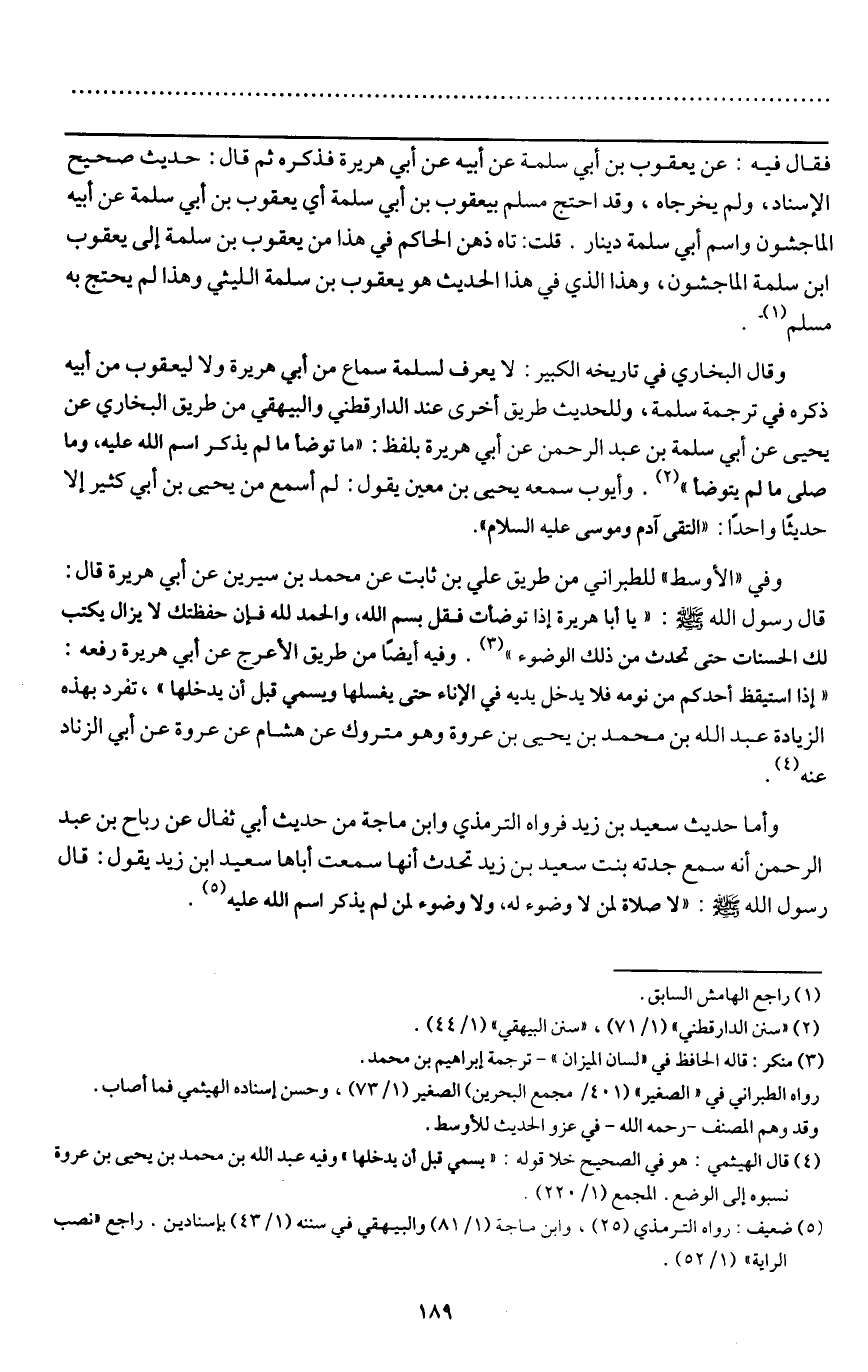 وقال البخاري في تاريخه الكبير: لا يعرف لسلمة سماع من أبي هريرة ولا ليعقوب من أبيه ذكره في ترجمة سلمة، وللحديث طريق أخرى عند الدارقطني والبيهقي من طريق البخاري عن يحيى عن أبي سلمة بن عبد الرحمن عن أبي هريرة بلفظ: «ما توضأ ما لم يذكر اسم الله عليه، وما صلى ما لم يتوضأ.» وأيوب سمعه يحيى بن معين يقول: لم أسمع من يحيى بن أبي كثير إلا حديثا واحدا: «التقى آدم وموسى - عَلَيْهِ السَّلَامُ -» .