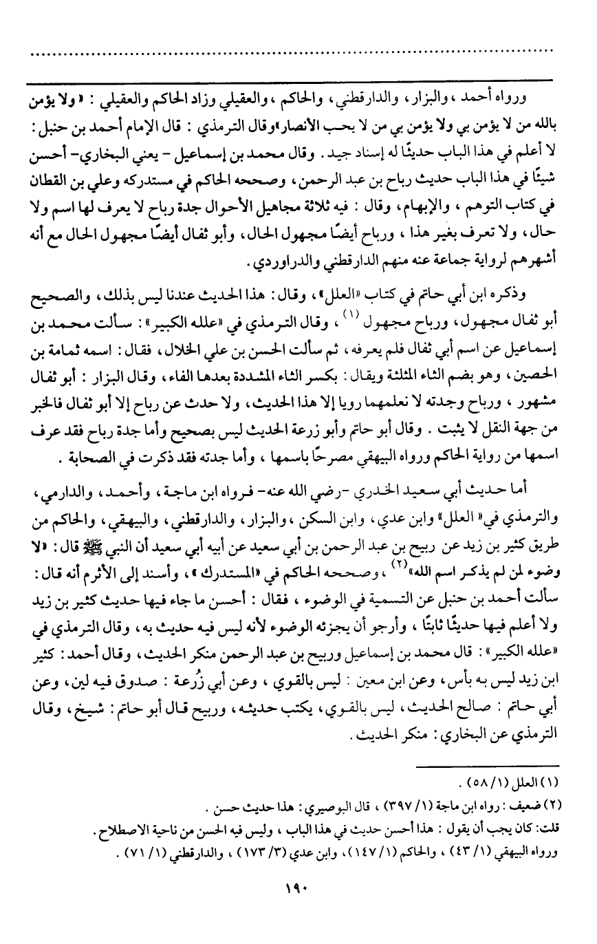 ـــــــــــــــــــــــــــــQورواه أحمد، والبزار، والدارقطني، والحاكم، والعقيلي وزاد الحاكم والعقيلي: «ولا يؤمن بالله من لا يؤمن بي، ولا يؤمن بي من لا يحب الأنصار» وقال الترمذي: قال الإمام أحمد بن حنبل: لا أعلم في هذا الباب حديثا له إسناد جيد. وقال محمد بن إسماعيل - يعني البخاري - أحسن شيء في هذا الباب حديث رباح بن عبد الرحمن، وصححه الحاكم في مستدركه وعلي بن القطان في كتاب التوهم، والإبهام، وقال: فيه ثلاثة مجاهيل الأحوال، جدة رباح لا يعرف لها اسم ولا حال، ولا تعرف بغير هذا، ورباح أيضا مجهول الحال، وأبو ثفال أيضا مجهول الحال مع أنه أشهرهم لرواية جماعة عنه منهم الدارقطني والدراوردي.