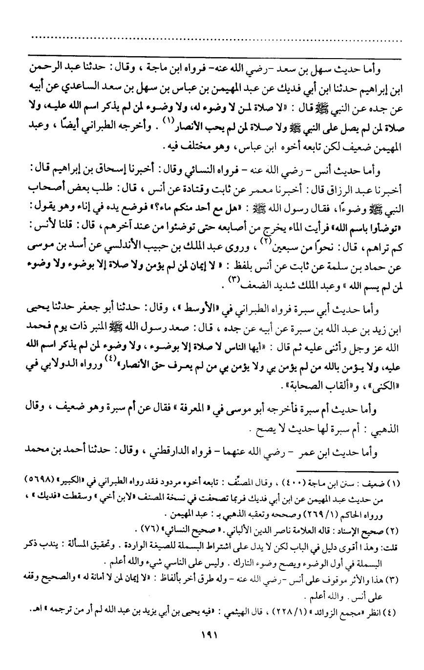 ـــــــــــــــــــــــــــــQوأما حديث سهل بن سعد - رَضِيَ اللَّهُ عَنْهُ - فرواه ابن ماجه، وقال: حدثنا عبد الرحمن بن إبراهيم حدثنا ابن أبي فديك عن عبد المهيمن بن عباس بن سهل بن سعد الساعدي عن أبيه عن جده عن النبي - صَلَّى اللَّهُ عَلَيْهِ وَسَلَّمَ - «قال: " لا صلاة لمن لا وضوء له، ولا وضوء لمن لم يذكر اسم الله عليه، ولا صلاة لمن لم يصل على النبي - صَلَّى اللَّهُ عَلَيْهِ وَسَلَّمَ - ولا صلاة لمن لم يحب الأنصار.» وأخرجه الطبراني أيضا، وعبد المهيمن ضعيف لكن تابعه أخوه ابن عباس، وهو مختلف فيه.