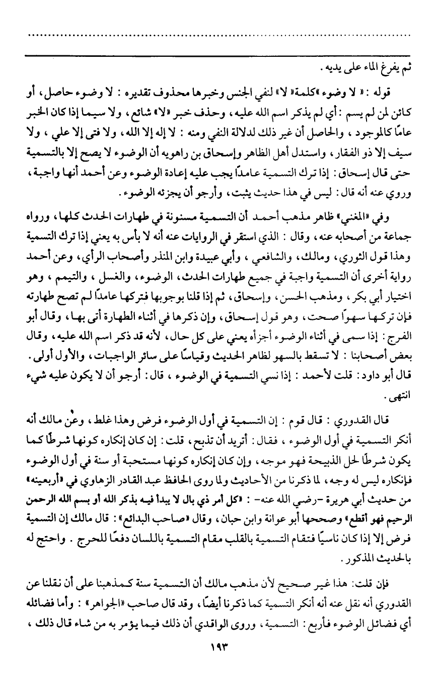 قال القدوري: قال قوم: إن التسمية في أول الوضوء فرض وهذا غلط، وعن مالك أنه أنكر التسمية في أول الوضوء، فقال: أتريد أن تذبح، قلت: إن كان إنكاره كونها شرطا كما يكون شرطا لحل الذبيحة فهو موجه، وإن كان إنكاره كونها مستحبة أو سنة في أول الوضوء فإنكاره ليس له وجه، لما ذكرنا من الأحاديث ولما روى الحافظ عبد القادر الزهاوي في " أربعينه " من حديث أبي هريرة - رَضِيَ اللَّهُ عَنْهُ -: «كل أمر ذي بال لا يبدأ فيه بذكر الله أو بِسْمِ اللَّهِ الرَّحْمَنِ الرَّحِيمِ فهو أقطع» وصححها أبو عوانة وابن حبان، وقال " صاحب البدائع ": قال مالك إن التسمية فرض إلا إذا كان ناسيا فتقام التسمية بالقلب مقام التسمية باللسان دفعا للحرج. واحتج له بالحديث المذكور.