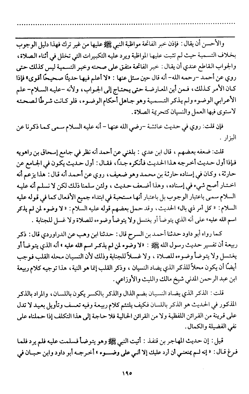 كما رواه أبو داود حدثنا أحمد بن السرح قال: حدثنا ابن وهب عن الدراوردي قال: ذكر ربيعة أن تفسير حديث رسول الله - صَلَّى اللَّهُ عَلَيْهِ وَسَلَّمَ -: «لا وضوء لمن لم يذكر اسم الله عليه» أنه الذي يتوضأ أو يغتسل ولا يتوضأ وضوءه للصلاة، ولا غسلا للجنابة وذلك لأن النسيان محله القلب فوجب أيضا أن يكون محلا للذكر الذي يضاد النسيان، وذكر القلب إنما هو النية، هذا توجيه كلام ربيعة ابن عبد الرحمن المدني شيخ مالك والليث والأوزاعي.