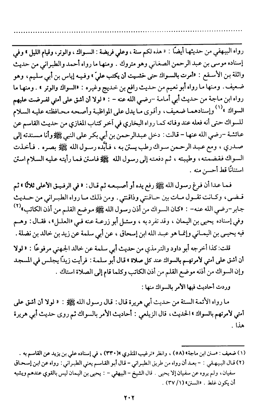 ما رواه الأئمة الستة من حديث أبي هريرة قال: قال رسول الله - صَلَّى اللَّهُ عَلَيْهِ وَسَلَّمَ -: «لولا أن أشق على أمتي لأمرتهم بالسواك» الحديث، قال الزيلعي: أحاديث الأمر بالسواك، ثم روى حديث أبي هريرة هذا.
