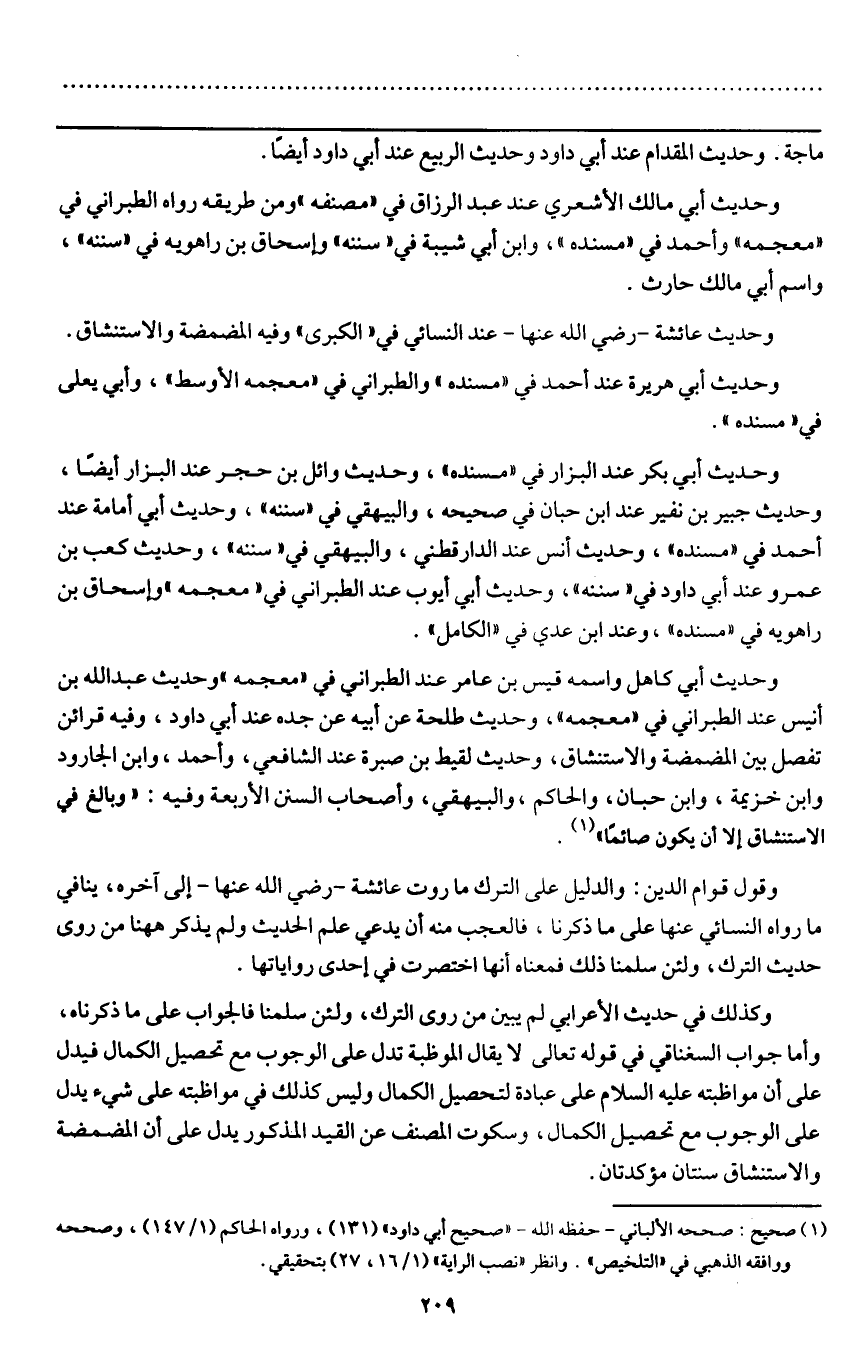 وحديث أبي كاهل واسمه قيس بن عامر عند الطبراني في " معجمه "، وحديث عبد الله بن أنيس عند الطبراني في " معجمه "، وحديث طلحة عن أبيه عن جده عند أبي داود، وفيه قرائن تفصل بين المضمضة والاستنشاق، وحديث لقيط بن صبرة عند الشافعي، وأحمد، وابن الجارود وابن خزيمة، وابن حبان، والحاكم، والبيهقي، وأصحاب السنن الأربعة وفيه: «وبالغ في الاستنشاق إلا أن تكون صائما.»