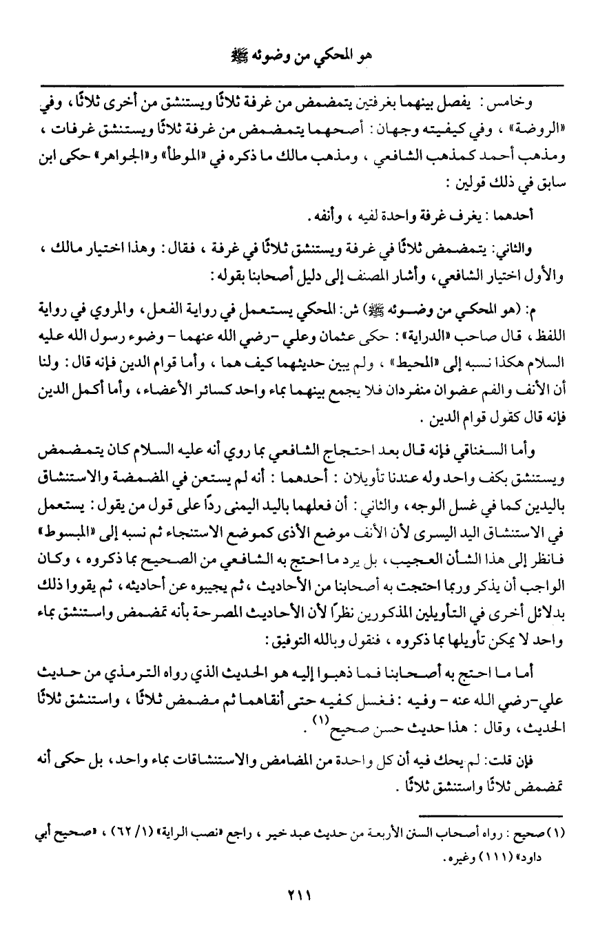 أما ما احتج به أصحابنا فما ذهبوا إليه هو الحديث الذي رواه الترمذي من حديث علي - رَضِيَ اللَّهُ عَنْهُ - وفيه: «فغسل كفيه حتى أنقاهما ثم مضمض ثلاثا، واستنشق ثلاثا.» الحديث، وقال: هذا حديث حسن صحيح.