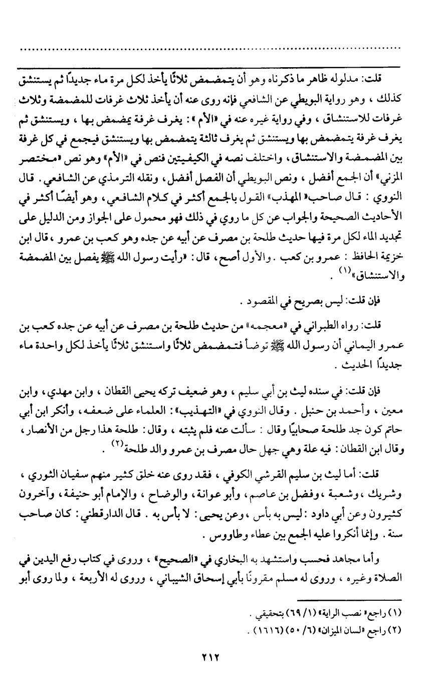 ـــــــــــــــــــــــــــــQقلت: مدلوله ظاهر ما ذكرناه وهو أن يتمضمض ثلاثا يأخذ لكل مرة ماء جديدا ثم يستنشق كذلك، وهو رواية البويطي عن الشافعي فإنه روى عنه أن يأخذ ثلاث غرفات للمضمضة وثلاث غرفات للاستنشاق، وفي رواية غيره عنه في " الأم ": يغرف غرفة يمضمض بها ويستنشق، ثم يغرف غرفة يتمضمض بها ويستنشق، ثم يغرف ثالثة يتمضمض بها ويستنشق فيجمع في كل غرفة بين المضمضة والاستنشاق، واختلف نصه في الكيفيتين فنص في " الأم " وهو نص " مختصر المزني " أن الجمع أفضل، ونص البويطي أن الفصل أفضل، ونقله الترمذي عن الشافعي. قال النووي: قال صاحب " المهذب " القول بالجمع أكثر في كلام الشافعي، وهو أيضا أكثر في الأحاديث الصحيحة والجواب عن كل ما روي في ذلك فهو محمول على الجواز، ومن الدليل على تجديد الماء لكل مرة فيها حديث طلحة بن مصرف عن أبيه عن جده وهو كعب بن عمرو، قال ابن خزيمة الحافظ: عمرو بن كعب. والأول أصح، قال: «رأيت رسول الله - صَلَّى اللَّهُ عَلَيْهِ وَسَلَّمَ - يفصل بين المضمضة والاستنشاق»