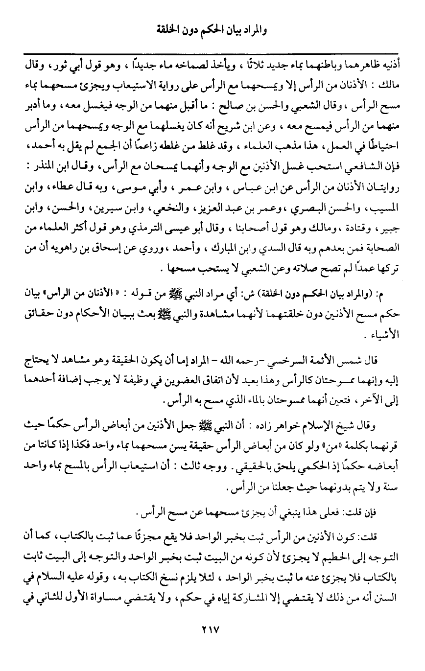 قال شمس الأئمة السرخسي - رَحِمَهُ اللَّهُ - المراد إما أن يكون الحقيقة وهو مشاهد لا يحتاج إليه وإنهما ممسوحتان كالرأس وهذا بعيد؛ لأن اتفاق العضوين في وظيفة لا يوجب إضافة أحدهما إلى الآخر، فتعين أنهما ممسوحتان بالماء الذي مسح به الرأس.