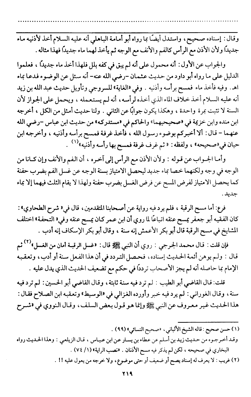 ـــــــــــــــــــــــــــــQوقال: إسناده صحيح، واستدل أيضا بما «رواه أبو أمامة الباهلي أنه - عَلَيْهِ السَّلَامُ - أخذ لأذنيه ماء جديدا» ولأن الأذن مع الرأس كالفم والأنف مع الوجه ثم يأخذ لهما ماء جديدا فهذا مثاله.