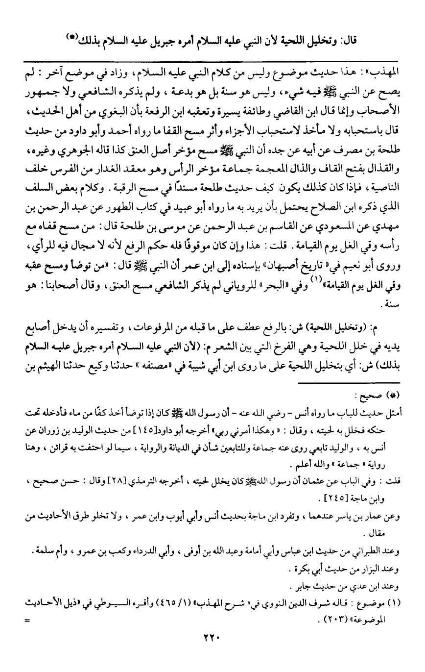 م: (وتخليل اللحية) ش: بالرفع عطف على ما قبله من المرفوعات، وتفسيره أن يدخل أصابع يديه في خلل اللحية وهي الفرج التي بين الشعر م: (لأن النبي - عَلَيْهِ السَّلَامُ - أمره جبريل - عَلَيْهِ السَّلَامُ - بذلك) ش: أي بتخليل اللحية على ما روى ابن أبي شيبة في " مصنفه " حدثنا وكيع حدثنا الهيثم بن