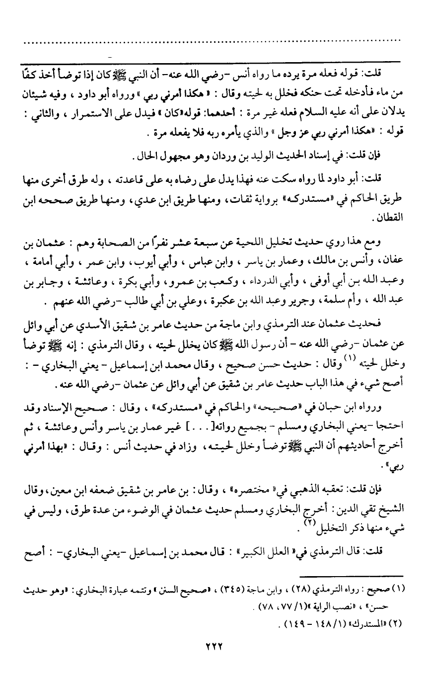 ورواه ابن حبان في " صحيحه " والحاكم في " مستدركه "، وقال: صحيح الإسناد وقد احتجا - يعني البخاري ومسلم - بجميع رواته [ ... ] غير عمار بن ياسر وأنس وعائشة، ثم أخرج أحاديثهم «أن النبي - صَلَّى اللَّهُ عَلَيْهِ وَسَلَّمَ - توضأ وخلل لحيته» وزاد في حديث أنس: وقال: «بهذا أمرني ربي»