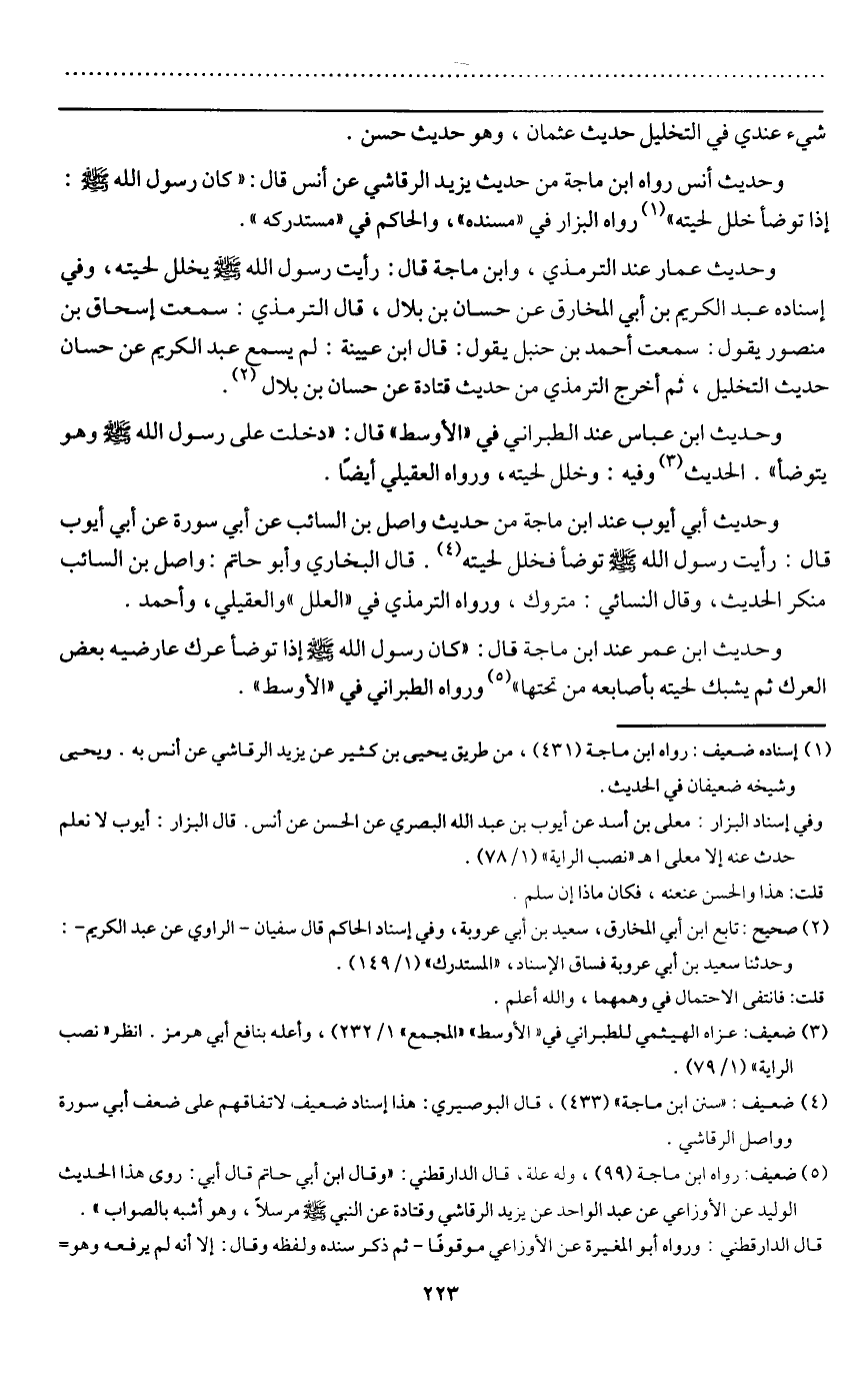 وحديث أنس رواه ابن ماجه من حديث يزيد الرقاشي عن أنس قال: «كان رسول الله - صَلَّى اللَّهُ عَلَيْهِ وَسَلَّمَ -: إذا توضأ خلل لحيته» رواه البزار في " مسنده "، والحاكم في " مستدركه ".