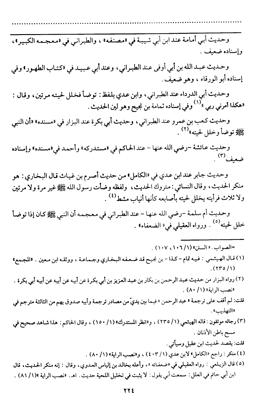 وحديث أم سلمة - رَضِيَ اللَّهُ عَنْهَا - عند الطبراني في معجمه «أن النبي - صَلَّى اللَّهُ عَلَيْهِ وَسَلَّمَ - كان إذا توضأ خلل لحيته.» ورواه العقيلي في " الضعفاء ".