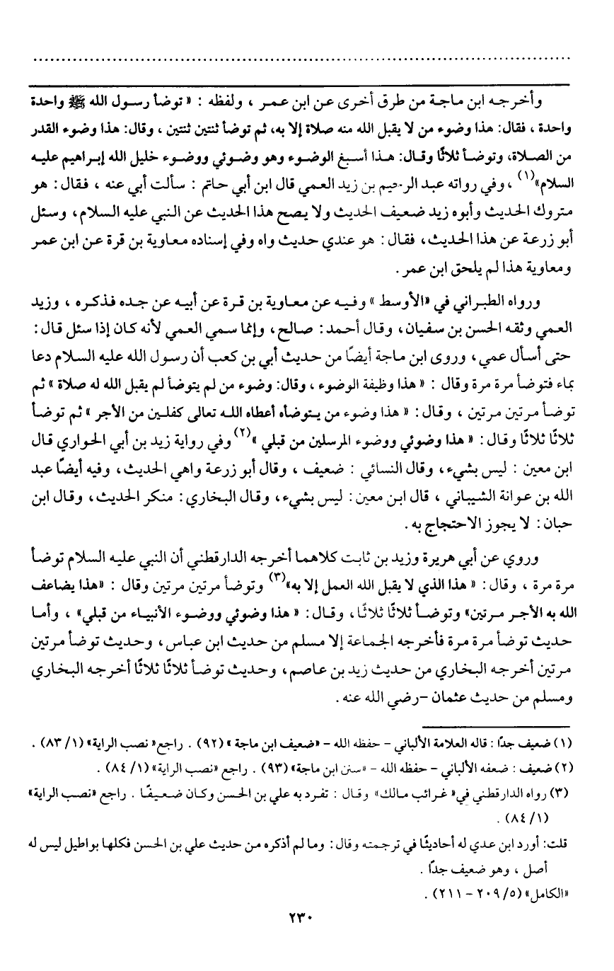 ـــــــــــــــــــــــــــــQوأخرجه ابن ماجه من طرق أخرى عن ابن عمر، ولفظه: «توضأ رسول الله - صَلَّى اللَّهُ عَلَيْهِ وَسَلَّمَ - واحدة واحدة، فقال: هذا وضوء من لا يقبل الله منه صلاة إلا به، ثم توضأ ثنتين ثنتين، وقال: هذا وضوء القدر من الصلاة، وتوضأ ثلاثا وقال: هذا أسبغ الوضوء، وهو وضوئي ووضوء خليل الله إبراهيم - عَلَيْهِ السَّلَامُ -» وفي رواته عبد الرحيم بن زيد العمي قال ابن أبي حاتم: سألت أبي عنه، فقال: هو متروك الحديث وأبوه زيد ضعيف الحديث، ولا يصح هذا الحديث عن النبي - عَلَيْهِ السَّلَامُ -، وسئل أبو زرعة عن هذا الحديث، فقال: هو عندي حديث واه وفي إسناده معاوية بن قرة عن ابن عمر ومعاوية هذا لم يلحق ابن عمر.