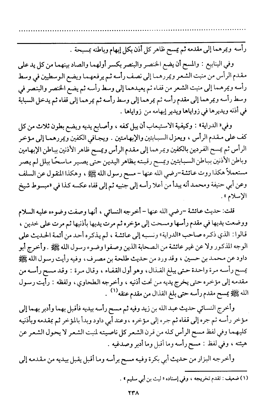 وأخرج النسائي حديث عبد الله بن زيد وفيه «ثم مسح رأسه بيديه فأقبل بهما وأدبر بهما إلى مؤخر رأسه ثم جره إلى قفاه ثم جره إلى مؤخره، وعند أبي داود وبدأ بالمؤخر ثم بمقدمه وبأذنيه كليهما، وفي لفظ مسح الرأس كله من قرن الشعر كل ناصيته لمنبت الشعر لا يحول الشعر عن هيئته، وفي لفظ: مسح رأسه وما أقبل وما أدبر وصدغيه» .