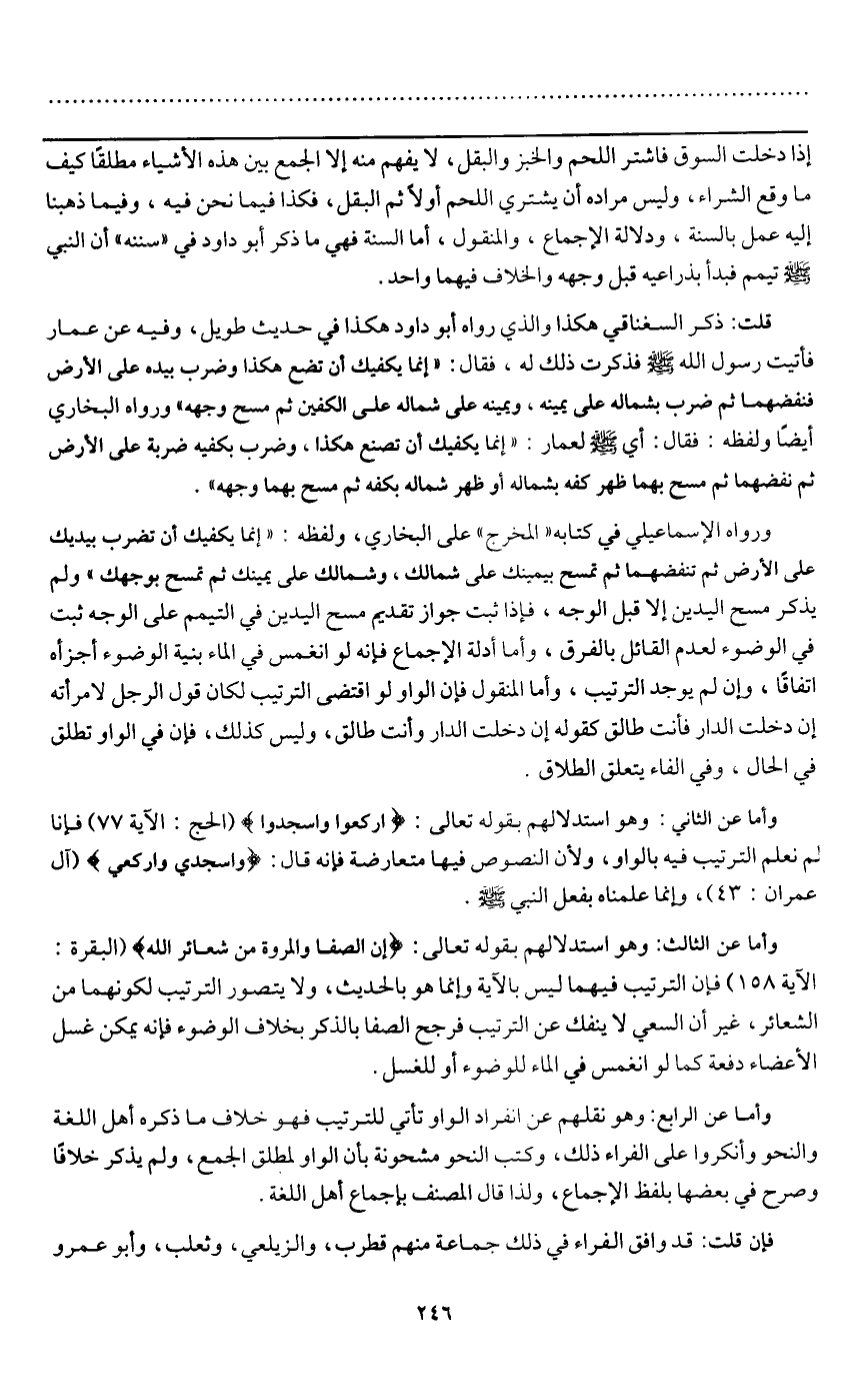 ورواه الإسماعيلي في كتابه " المخرج " على البخاري، ولفظه: " إنما يكفيك أن تضرب بيديك على الأرض ثم تنفضهما ثم تمسح بيمينك على شمالك، وشمالك على يمينك ثم تمسح بوجهك» ولم يذكر مسح اليدين إلا قبل الوجه، فإذا ثبت جواز تقديم مسح اليدين في التيمم على الوجه ثبت في الوضوء لعدم القائل بالفرق، وأما أدلة الإجماع فإنه لو انغمس في الماء بنية الوضوء أجزأه اتفاقا، وإن لم يوجد الترتيب، وأما المنقول فإن الواو لو اقتضى الترتيب لكان قول الرجل لامرأته إن دخلت الدار فأنت طالق كقوله إن دخلت الدار وأنت طالق، وليس كذلك، فإن في الواو تطلق في الحال، وفي الفاء يتعلق الطلاق.