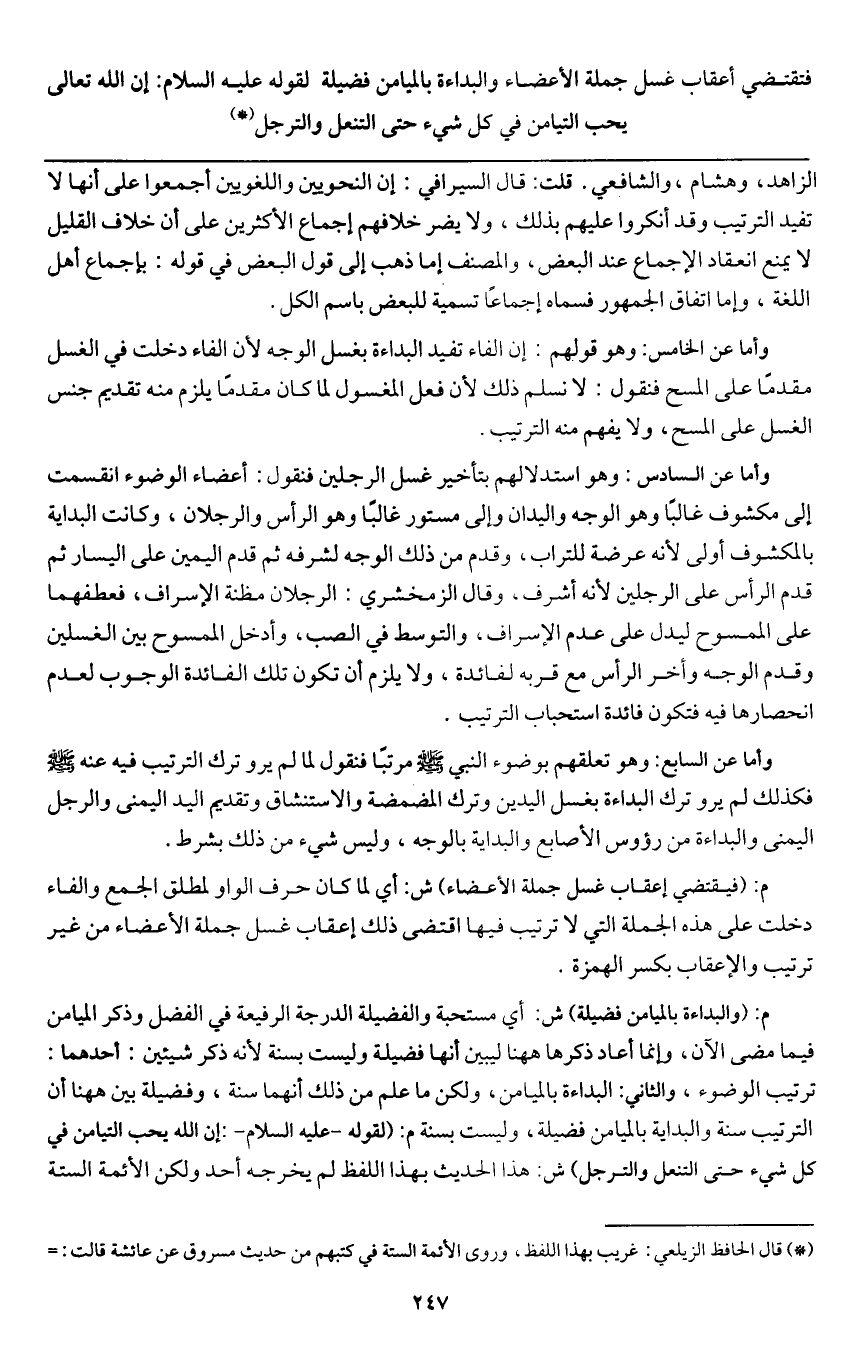 وأما عن السابع: وهو تعلقهم بوضوء النبي - صَلَّى اللَّهُ عَلَيْهِ وَسَلَّمَ - مرتبا، فنقول: لما لم يرو ترك الترتيب فيه عنه - صَلَّى اللَّهُ عَلَيْهِ وَسَلَّمَ - فكذلك لم يرو ترك البداءة بغسل اليدين وترك المضمضة والاستنشاق وتقديم اليد اليمني والرجل اليمني والبداءة من رؤوس الأصابع والبداية بالوجه، وليس شيء من ذلك بشرط.