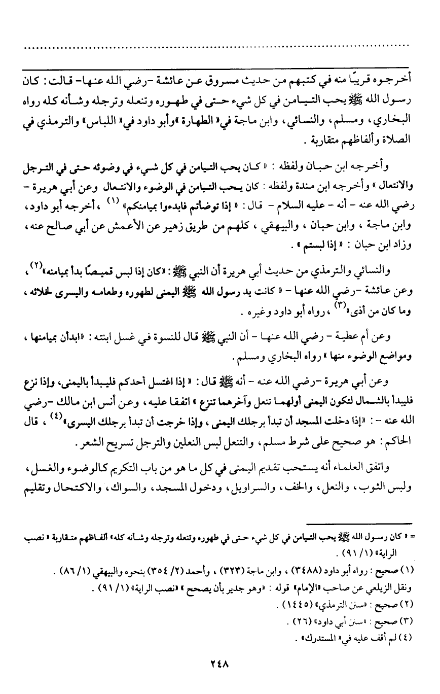 وأخرجه ابن حبان ولفظه: «كان يحب التيامن في كل شيء في وضوئه حتى في الترجل والانتعال» وأخرجه ابن مندة ولفظه: «كان يحب التيامن في الوضوء والانتعال» وعن أبي هريرة - رَضِيَ اللَّهُ عَنْهُ - أنه - عَلَيْهِ السَّلَامُ - «قال: " إذا توضأتم فابدءوا بميامنكم» أخرجه أبو داود، وابن ماجه، وابن حبان، والبيهقي، كلهم من طريق زهير عن الأعمش عن أبي صالح عنه، وزاد ابن حبان: «إذا لبستم.»