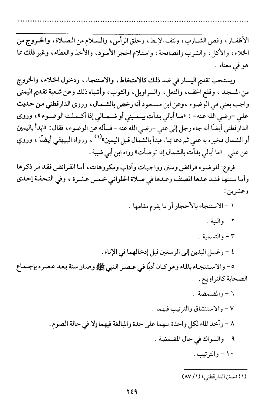 ويستحب تقديم اليسار في ضد ذلك كالامتخاط، والاستنجاء، ودخول الخلاء، والخروج من المسجد، وقلع الخف، والنعل، والسراويل، والثوب، وأشباه ذلك، وعن شعبة تقديم اليمنى واجب يعني في الوضوء، وعن ابن مسعود أنه رخص بالشمال، وروى الدارقطني من حديث علي - رَضِيَ اللَّهُ عَنْهُ -: " ما أبالي بدأت بيميني أو شمالي إذا أكملت الوضوء "، وروى الدارقطني أيضا أنه جاء رجل إلى علي - رَضِيَ اللَّهُ عَنْهُ - فسأله عن الوضوء، فقال: " ابدأ باليمين أو الشمال، فخيره به علي، ثم دعا بماء فبدأ بالشمال قبل اليمين "، ورواه البيهقي أيضا، وروي عن علي: " ما أبالي بدأت بالشمال إذا توضأت " رواه ابن أبي شيبة.