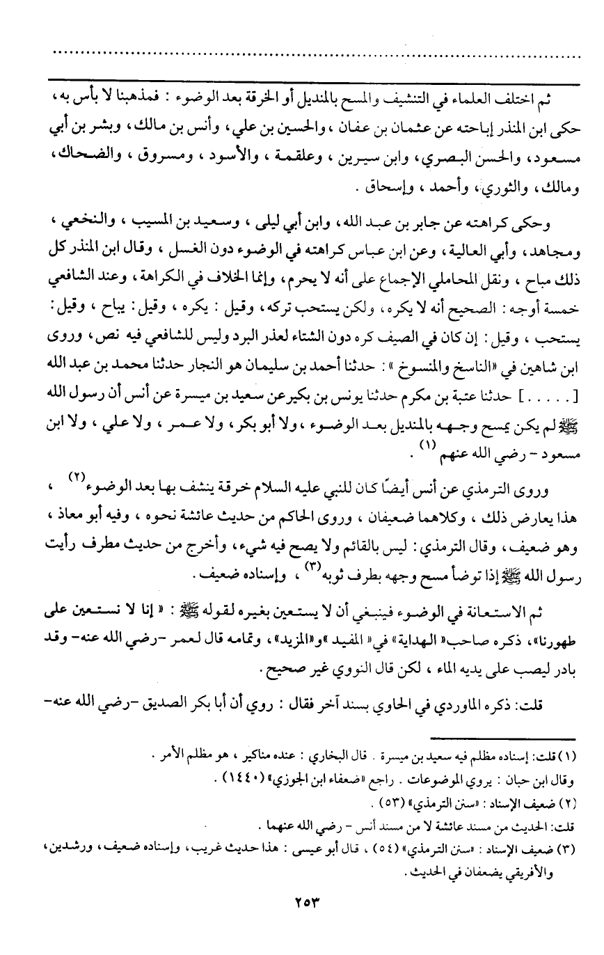 ـــــــــــــــــــــــــــــQثم اختلف العلماء في التنشيف والمسح بالمنديل أو الخرقة بعد الوضوء: فمذهبنا لا بأس به، حكى ابن المنذر إباحته عن عثمان بن عفان، والحسين بن علي، وأنس بن مالك، وبشير بن أبي مسعود، والحسن البصري، وابن سيرين، وعلقمة، والأسود، ومسروق، والضحاك، ومالك، والثوري، وأحمد، وإسحاق.