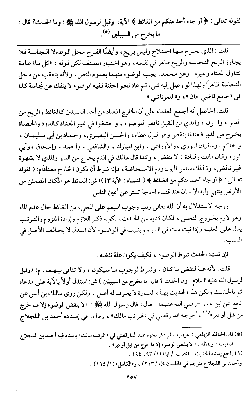لِقَوْلِهِ تَعَالَى: {أَوْ جَاءَ أَحَدٌ مِنْكُمْ مِنَ الْغَائِطِ} [النساء: 43] الآية، «وقيل لرسول الله - صَلَّى اللَّهُ عَلَيْهِ وَسَلَّمَ -: وما الحدث؟ قال: ما يخرج من السبيلين» .