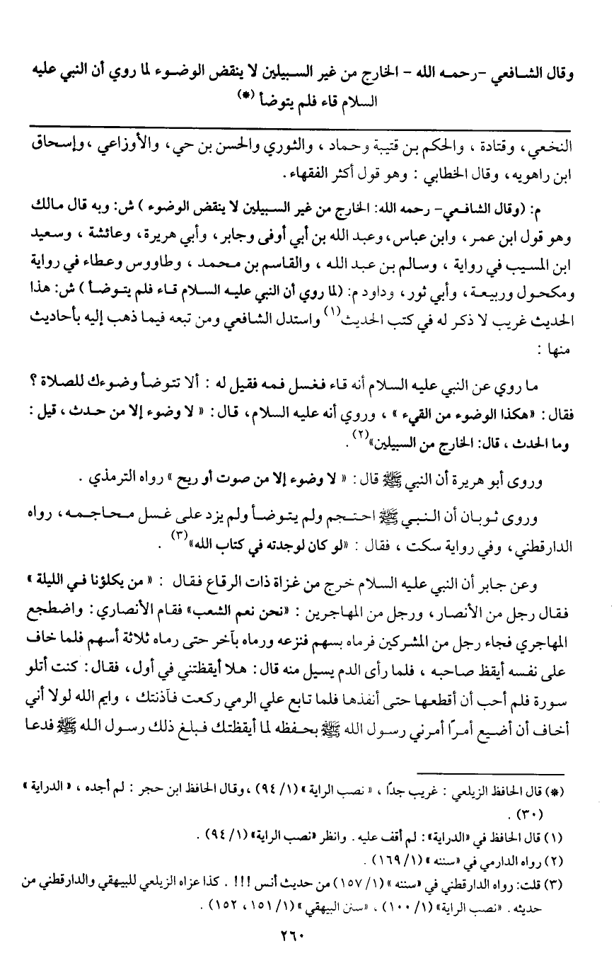 م: (وقال الشافعي - رَحِمَهُ اللَّهُ -: الخارج من غير السبيلين لا ينقض الوضوء) ش: وبه قال مالك وهو قول ابن عمر، وابن عباس، وعبد الله بن أبي أوفى وجابر، وأبي هريرة، وعائشة، وسعيد بن المسيب في رواية، وسالم بن عبد الله، والقاسم بن محمد، وطاووس وعطاء في رواية ومكحول وربيعة، وأبي ثور، وداود م: (لما روي أن النبي - عَلَيْهِ السَّلَامُ - قاء فلم يتوضأ) ش: هذا الحديث غريب لا ذكر له في كتب الحديث واستدل الشافعي ومن تبعه فيما ذهب إليه بأحاديث منها: