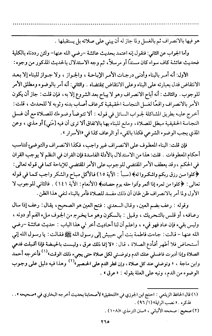الأول: أنه أمر بالبناء وأدنى درجات الأمر الإباحة، والجواز، ولا جواز للبناء إلا بعد الانتقاض فدل بعبارته على البناء وعلى الانتقاض بمقتضاه. والثاني: أنه أمر بالوضوء ومطلق الأمر للوجوب. والثالث: أنه أباح الانصراف وهو لا يباح بعد الشروع إلا به، فإن قلت: جاز أن يكون الأمر بالانصراف واقعا لغسل النجاسة الحقيقية كرعاف أصاب بدنه وثوبه لا للحدث، قلت: أخرج عليه بطريق المشاكلة لجواب السائل في قوله: ألا تتوضأ وضوءك للصلاة مع أن غسل النجاسة الحقيقية مبطل للصلاة، ومانع للبناء بها بالاتفاق ألا ترى أن فيه [مني] أو مذي، وعن المذي يجب الوضوء الشرعي فكذا بالقيء أو الرعاف كذا في " الأسرار ".