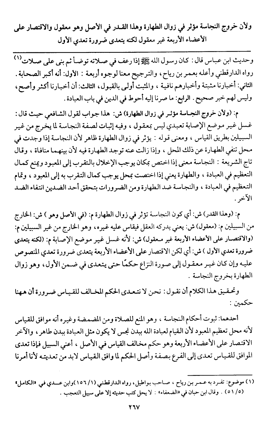 ـــــــــــــــــــــــــــــQوحديث ابن عباس قال: «كان رسول الله - صَلَّى اللَّهُ عَلَيْهِ وَسَلَّمَ - إذا رعف في صلاته توضأ ثم بنى على صلاته» رواه الدارقطني وأعله بعمر بن رياح، والترجيح معنا لوجوه أربعة: الأول: أنه أكبر الصحابة. الثاني: أخبارنا مثبتة وأخبارهم نافية، والمثبت أولى بالقبول، الثالث: أن أخبارنا أكثر وأصح، وليس لهم خبر صحيح. الرابع: ما صرنا إليه أحوط في الدين في باب العبادة.