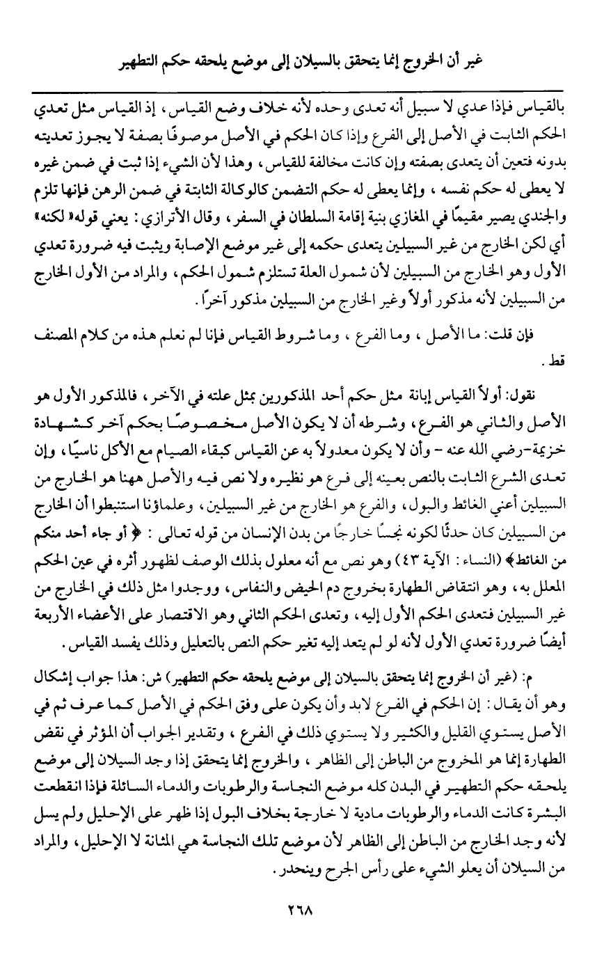 نقول: أولا القياس إبانة مثل حكم أحد المذكورين بمثل علته في الآخر، فالمذكور الأول هو الأصل والثاني هو الفرع، وشرطه أن لا يكون الأصل مخصوصا بحكم آخر كشهادة خزيمة - رَضِيَ اللَّهُ عَنْهُ - وأن لا يكون معدولا به عن القياس كبقاء الصيام مع الأكل ناسيا، وإن تعدى الشرع الثابت بالنص بعينه إلى فرع هو نظيره ولا نص فيه والأصل ههنا هو الخارج من السبيلين أعني الغائط والبول، والفرع هو الخارج من غير السبيلين، وعلماؤنا استنبطوا أن الخارج من السبيلين كان حدثا لكونه نجسا خارجا من بدن الإنسان من قَوْله تَعَالَى: {أَوْ جَاءَ أَحَدٌ مِنْكُمْ مِنَ الْغَائِطِ} [النساء: 43] (النساء: الآية 43) وهو نص من أنه معلول بذلك الوصف لظهور أثره في عين الحكم المعلل به، وهو انتقاض الطهارة بخروج دم الحيض والنفاس، ووجدوا مثل ذلك في الخارج من غير السبيلين فتعدى الحكم الأول إليه، وتعدى الحكم الثاني وهو الاقتصار على الأعضاء الأربعة أيضا ضرورة تعدي الأول لأنه لو لم يتعد إليه تغير حكم النص بالتعليل وذلك يفسد القياس.