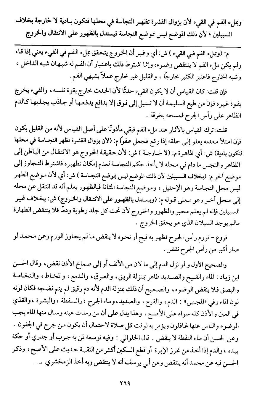 والصحيح الأول ولو نزل الدم إلى ما لان من الأنف أو إلى صماخ الأذن نقض، وقال الحسن بن زياد: الماء والقيح والصديد طاهر بمنزلة الريق، والعرق، والدمع، والمخاط، والنخامة والبصق فلا ينقض الوضوء، والصحيح أن ذلك بمنزلة الدم لأنه دم رقيق لم يتم نضجه فكان لونه لون الماء وفي " المجتبى ": الدم، والقيح، والصديد، وماء الجرح، والسفطة، والبشرة، والقذي في العين والأذن كله سواء على الأصح، وهذا يدل على أن من رمدت عينه وسال منها الماء يجب الوضوء والناس عنها غافلون ويؤمر به لوقت كل صلاة لاحتمال أن يكون من جرح في الجفون. وعن الحسن أن ماء النفطة لا ينقض. قال الحلواني: وفيه توسعة لمن به جرب أو جدري أو حكة بيده، والدم إذا أخذ من غرز الإبرة أو قطع السكين أكثر من النقبة حديث على الأصح، وذكر الحسن فيه عن محمد أنه ينتقض وعن أبي يوسف أنه لا ينتقض وبه أخذ الزمخشري.