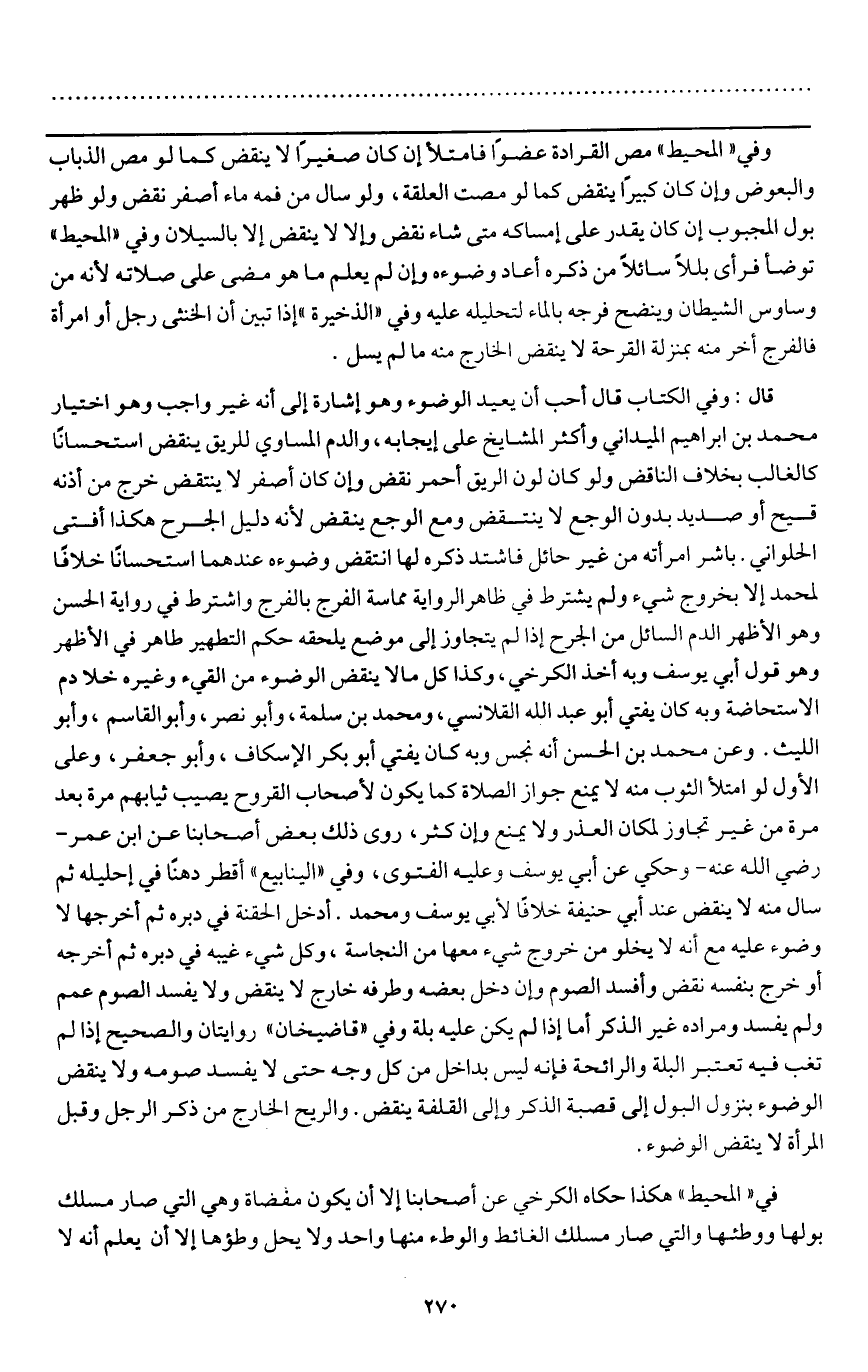 ـــــــــــــــــــــــــــــQوفي " المحيط " مص القرادة عضوا فامتلأ إن كان صغيرا لا ينقض كما لو مص الذباب والبعوض وإن كان كبيرا ينقض كما لو مصت العلقة، ولو سال من فمه ماء أصفر نقض ولو ظهر بول المجبوب إن كان يقدر على إمساكه متى شاء نقض وإلا لا ينقض إلا بالسيلان وفي " المحيط " توضأ فرأى بللا سائلا من ذكره أعاد وضوءه وإن لم يعلم ما هو مضى على صلاته لأنه من وساوس الشيطان وينضح فرجه بالماء لتحليله عليه وفي " الذخيرة " إذا تبين أن الخنثى رجل أو امرأة فالفرج أخر منه بمنزلة القرحة لا ينقض الخارج منه ما لم يسل.